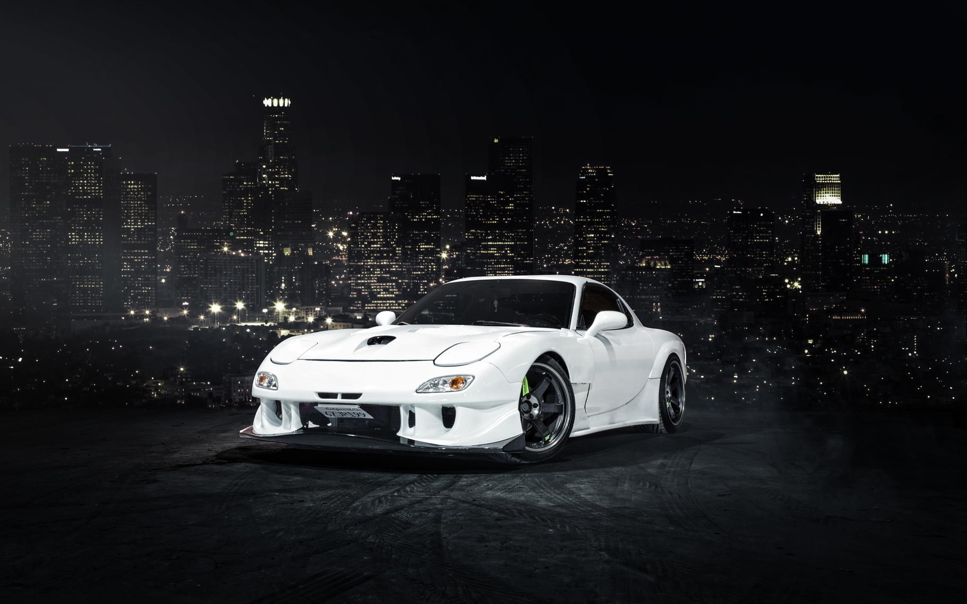 Description: A white sports car parked in front of a city at night with lights on the buildings in the background.