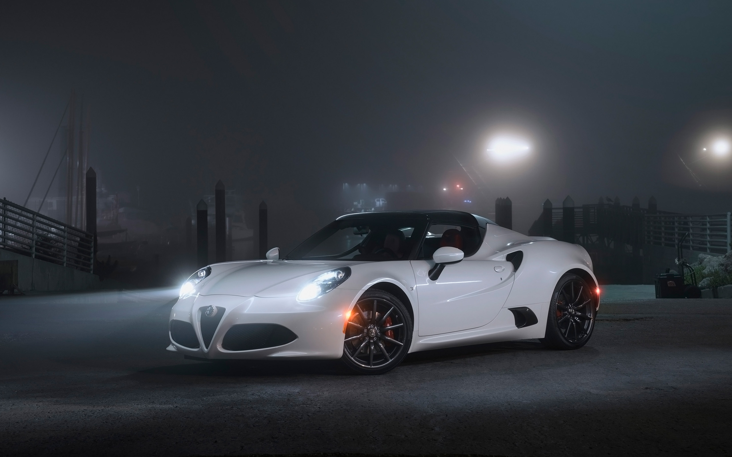 Description: A white sports car parked in a parking lot at night with lights on the buildings in the background and fog.
