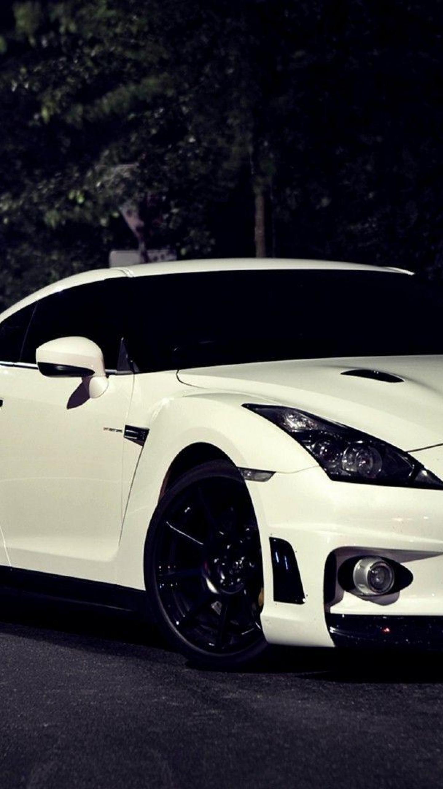 Description: A white sports car parked on the side of the road at night time with trees in the background and a person standing next to it.
