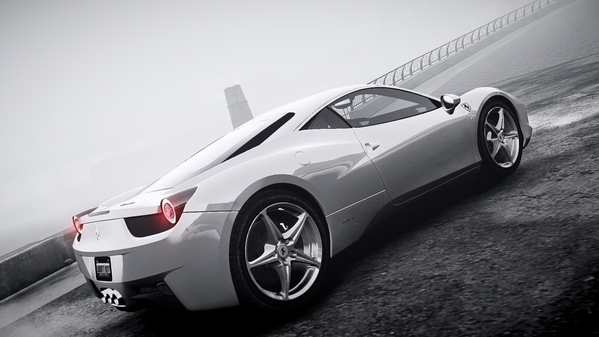 Description: A white sports car parked on a road near the ocean in a foggy day with a bridge in the background.