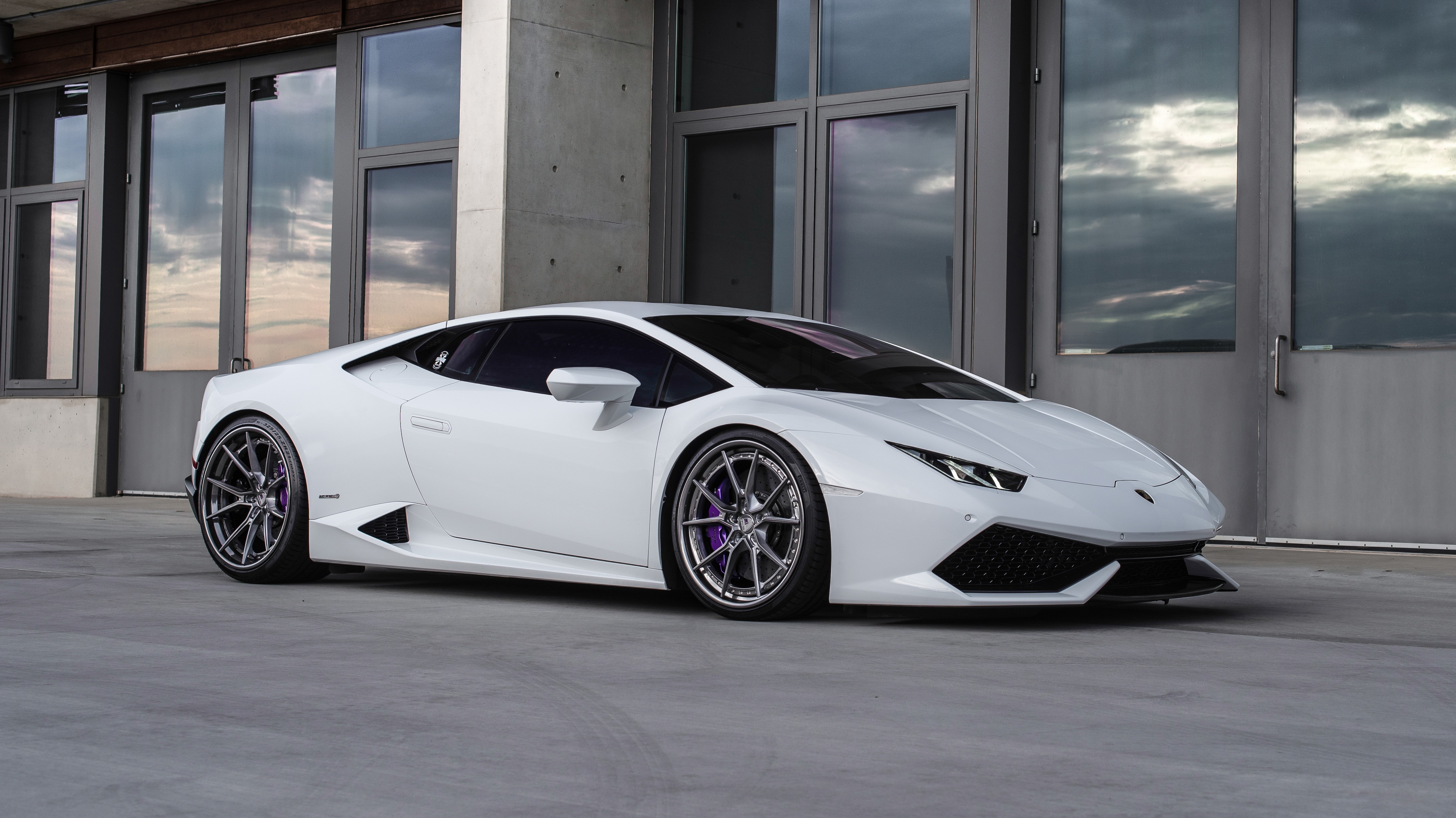 Description: A white sports car parked in front of a building with windows and a cloudy sky in the background.