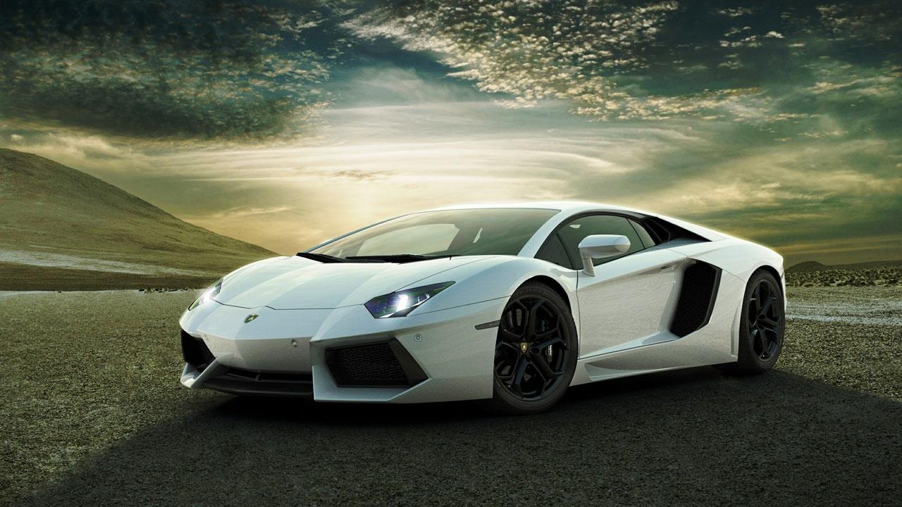 Description: A white sports car parked on a road with a sky background and clouds in the background.