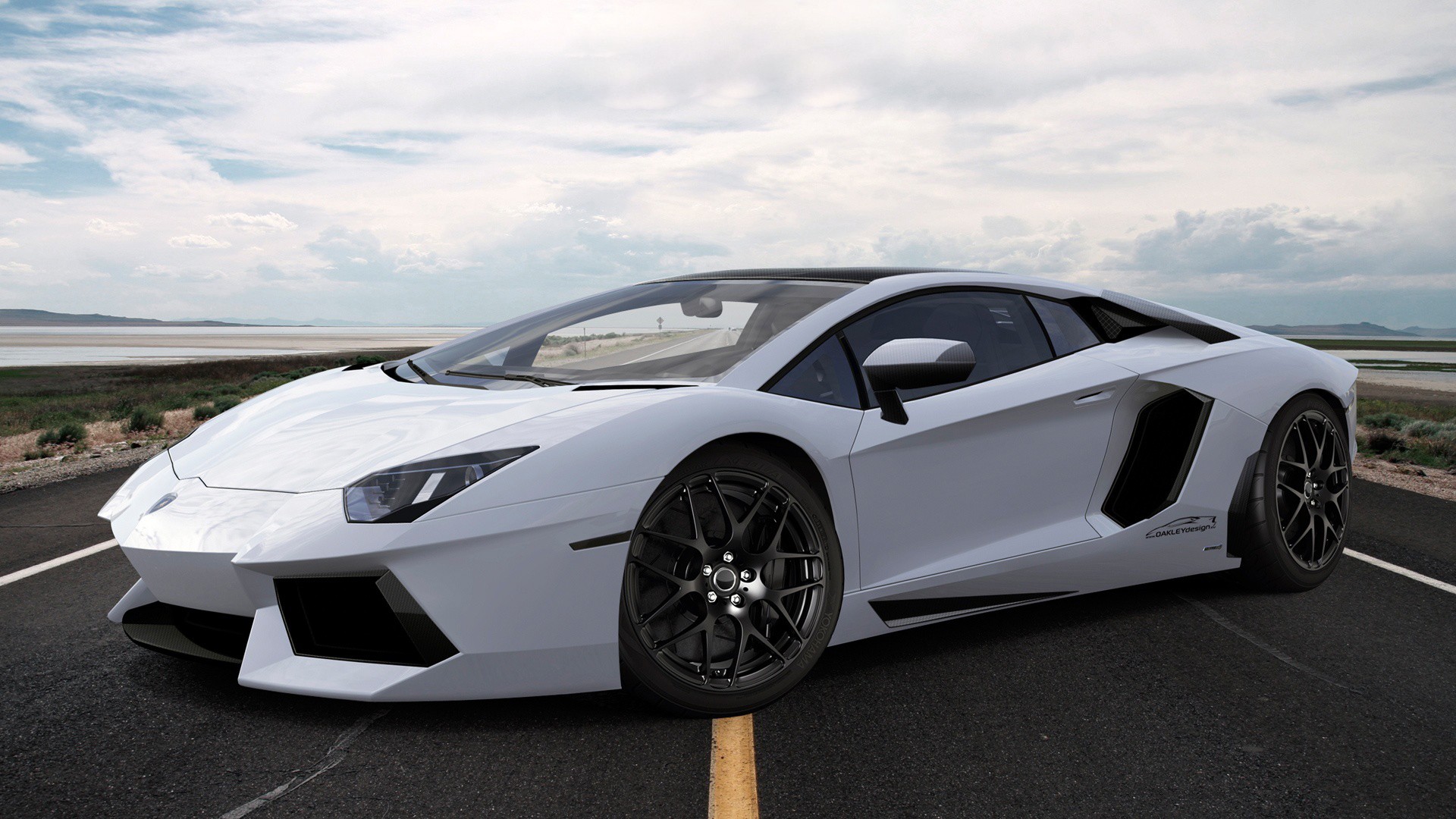 Description: A white sports car parked in a parking lot next to a road with a sky background and clouds in the sky.