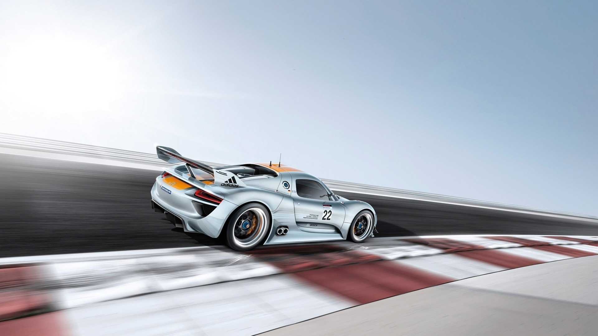 Description: A white sports car driving on a race track with a sky background and sun shining on the side of the car.