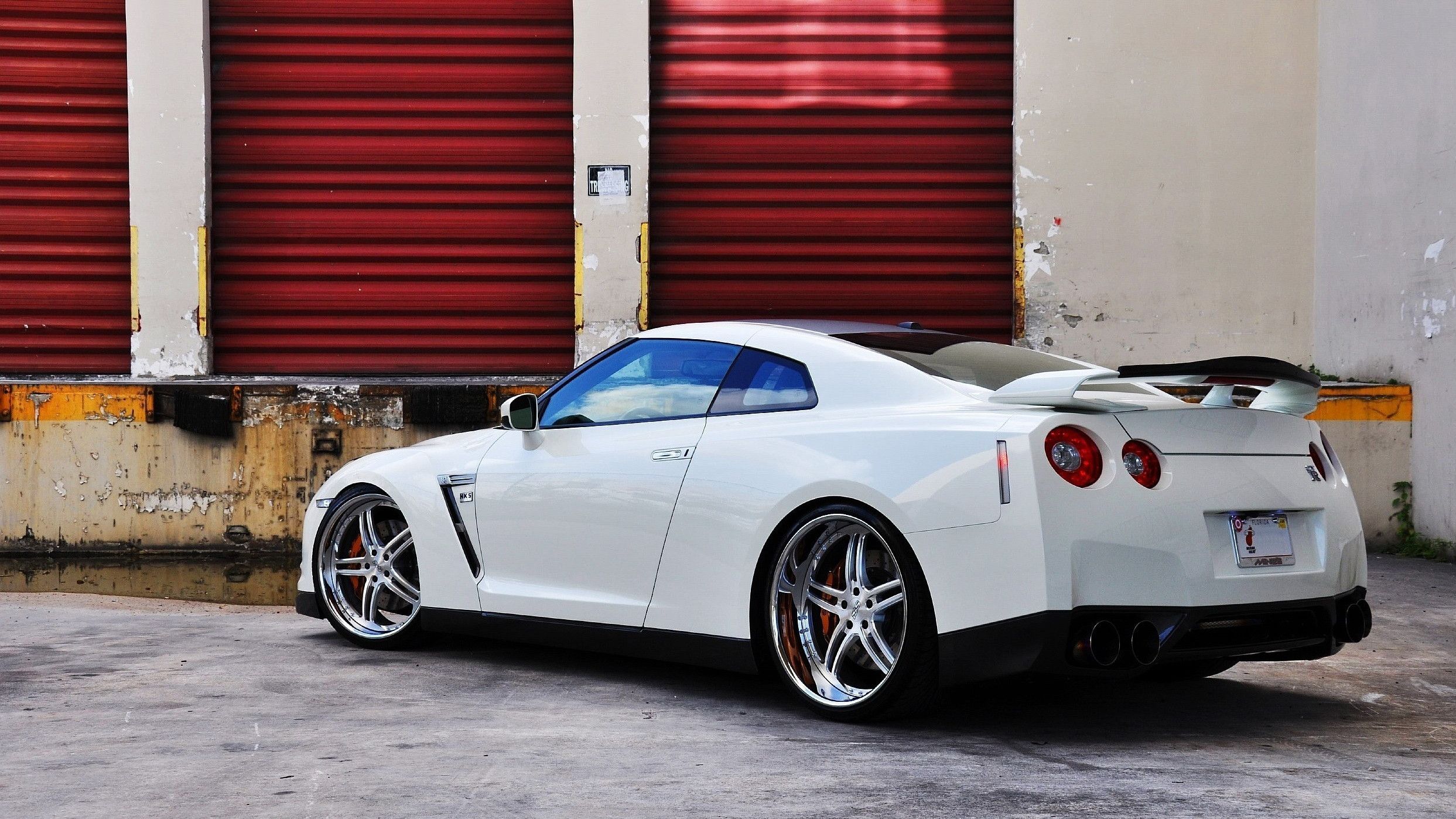 Description: A white sports car parked in front of a red garage door with a red roller door behind it and a red roller door behind it.