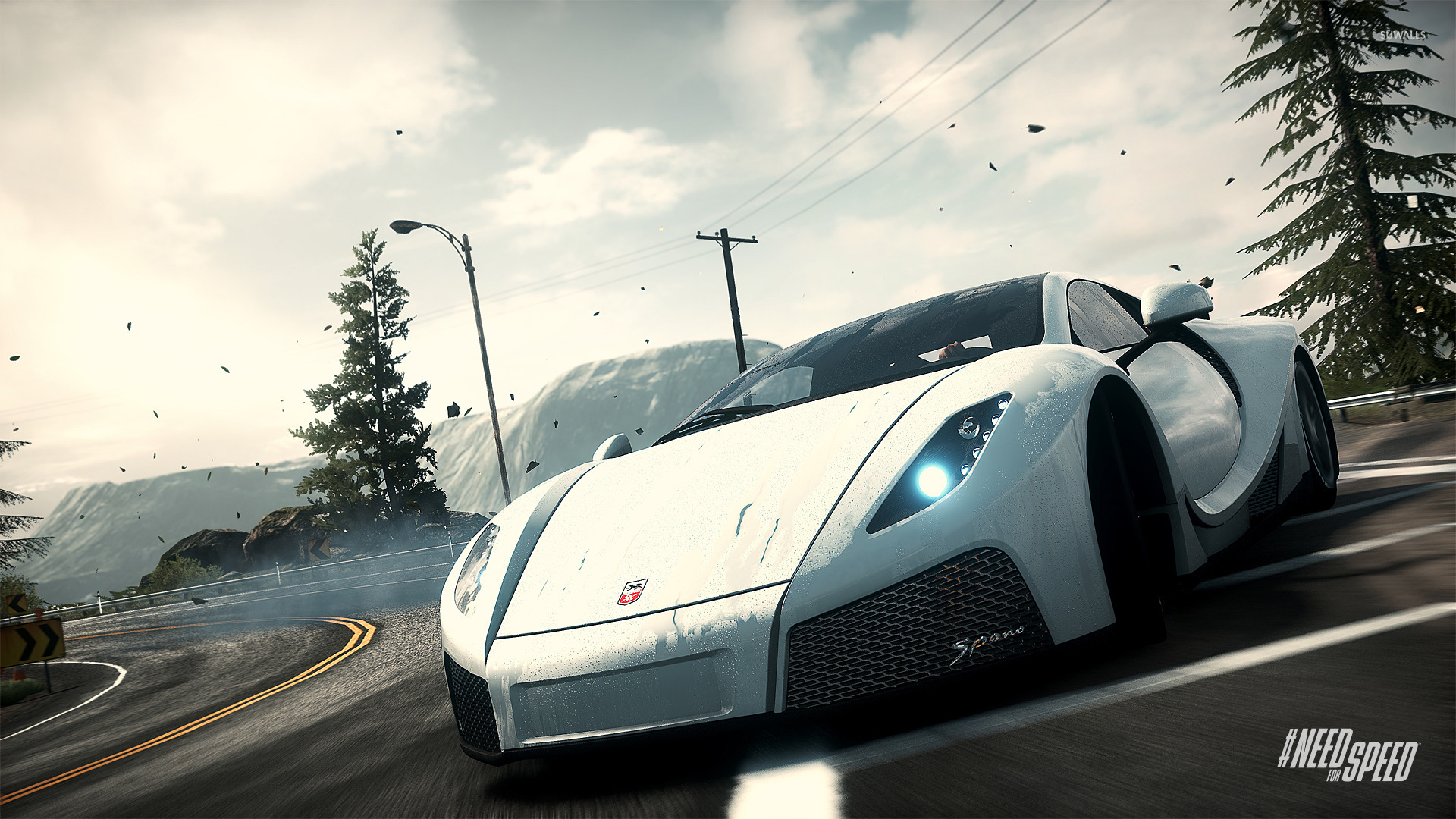 Description: A white sports car driving down a road next to a forest and mountains in the background with a cloudy sky.