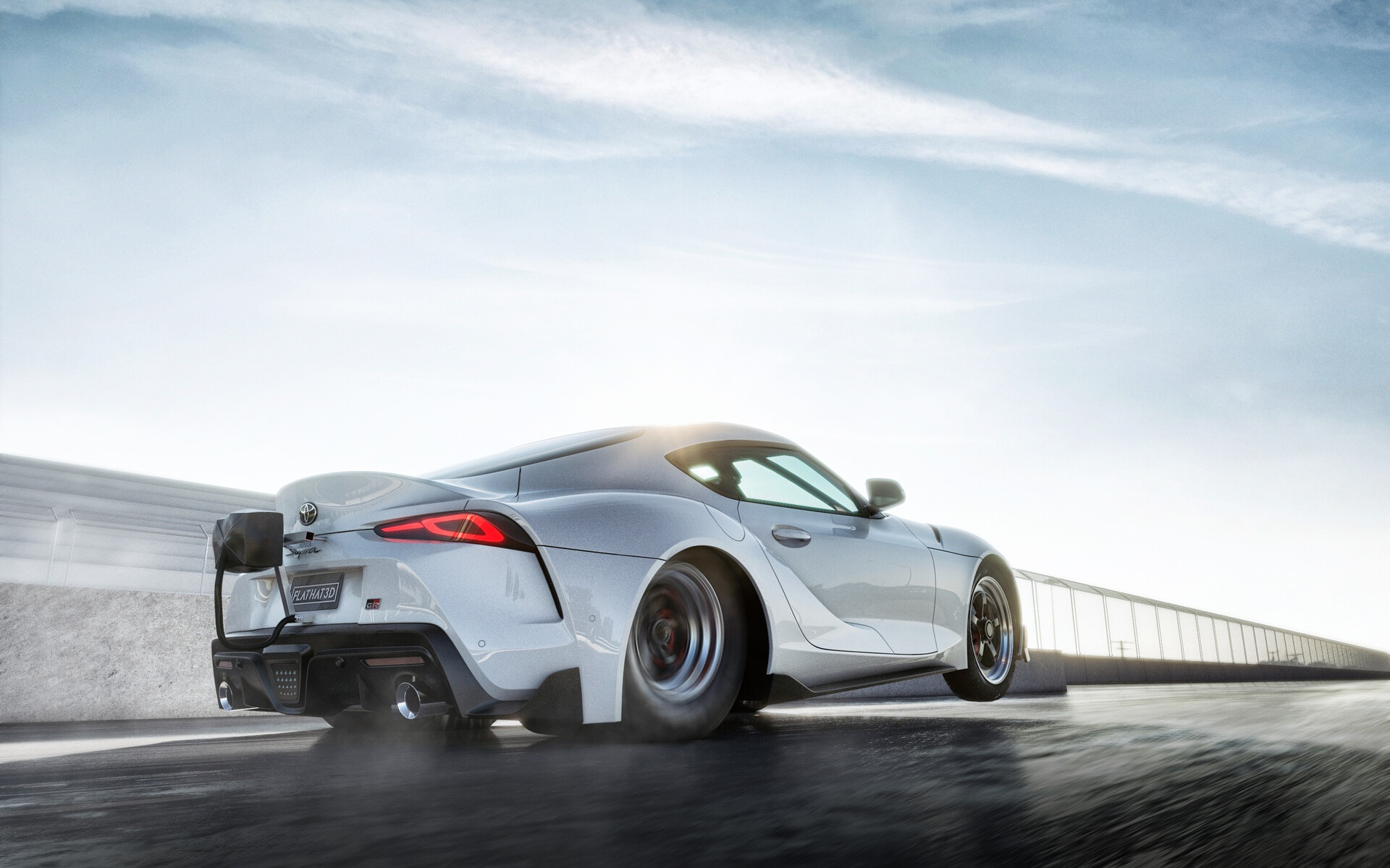 Description: A white sports car driving down a road next to a train track and a sky background with clouds and sun.