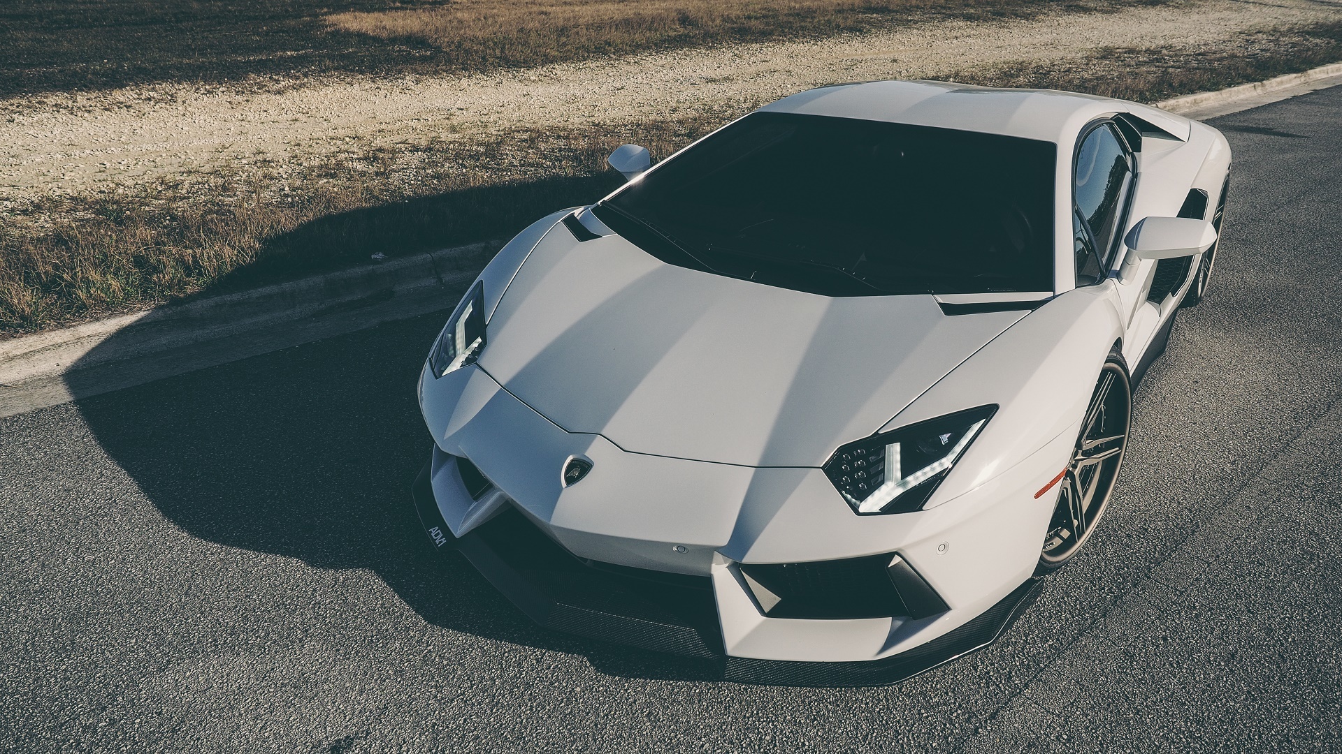Description: A white sports car parked on the side of the road next to a road sign and a grassy area.