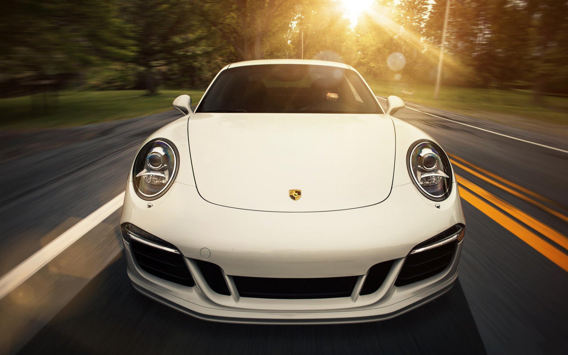Description: A white sports car driving down a road with the sun shining on it's headlight and the hood.