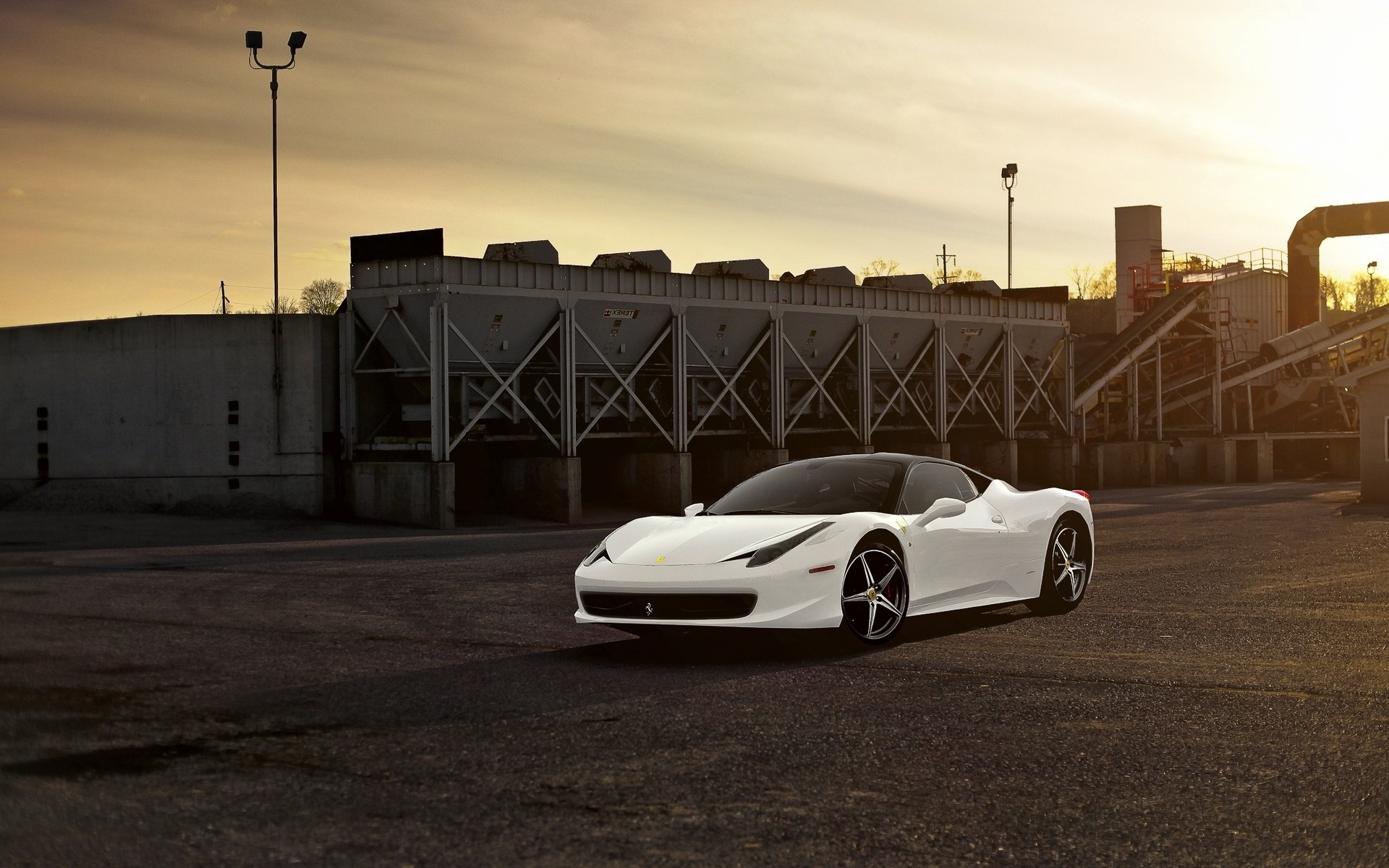 Description: A white sports car parked in a parking lot at sunset with a building in the background and a light pole in the foreground.