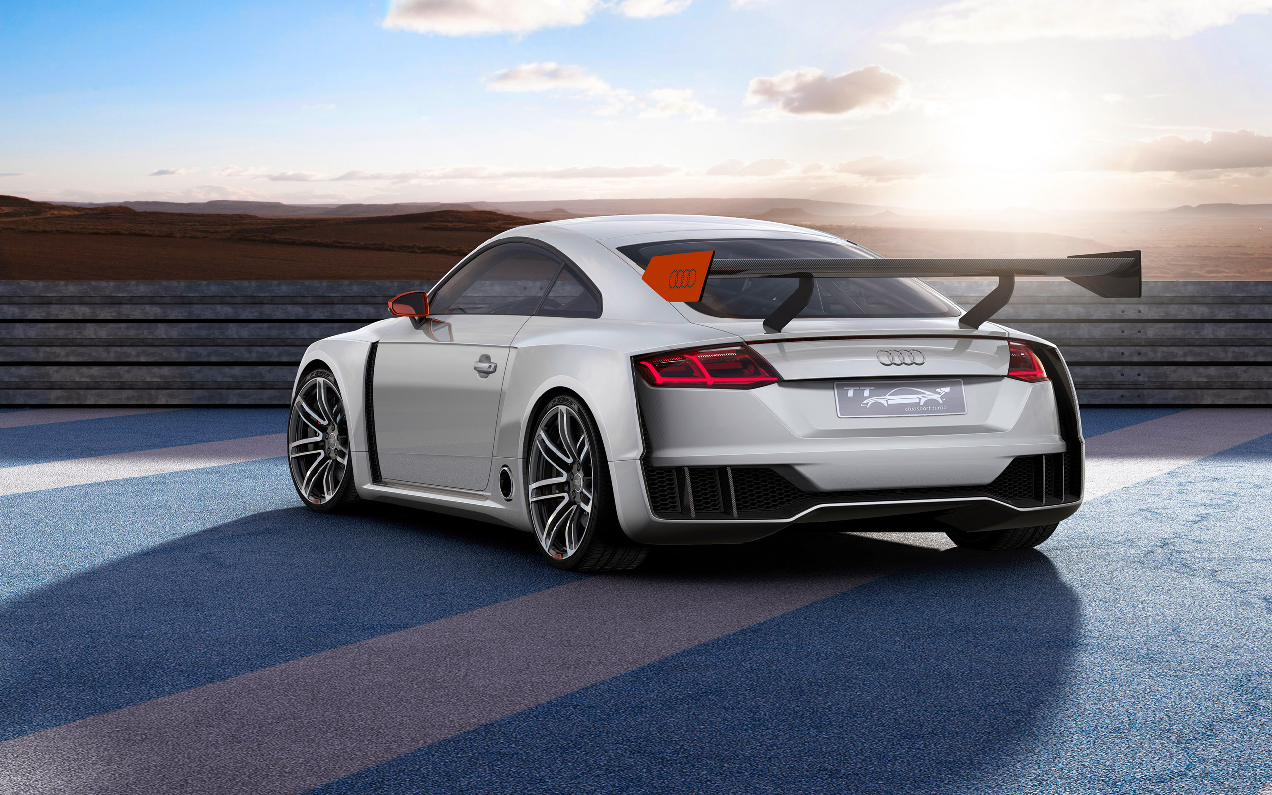 Description: A white sports car parked on a track with a sky background and clouds in the background.