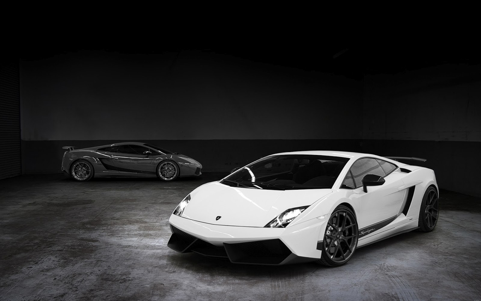 Description: Two white sports cars in a dark room with a black background and a black and white photo of one of them.