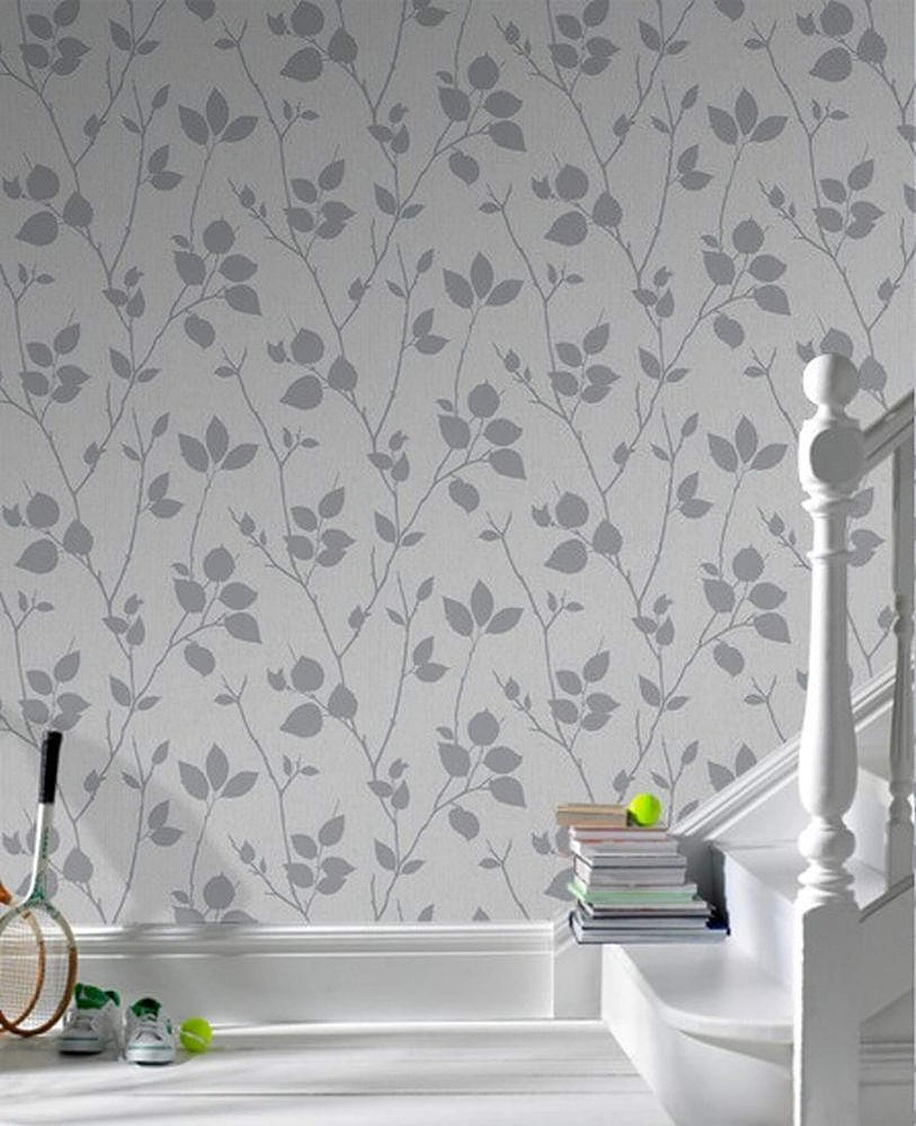 Description: A white staircase with a wallpaper with a flower pattern on it and a vase with a tennis racket on the floor.