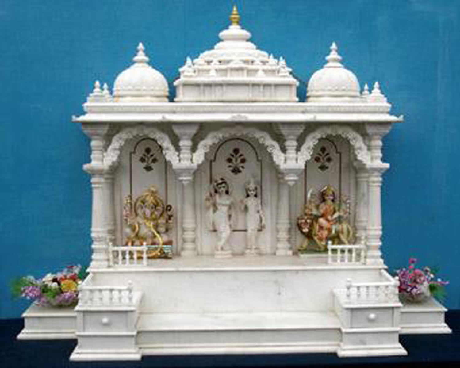 Description: A white statue of a man and woman in a temple setting with flowers on the side of the statue.