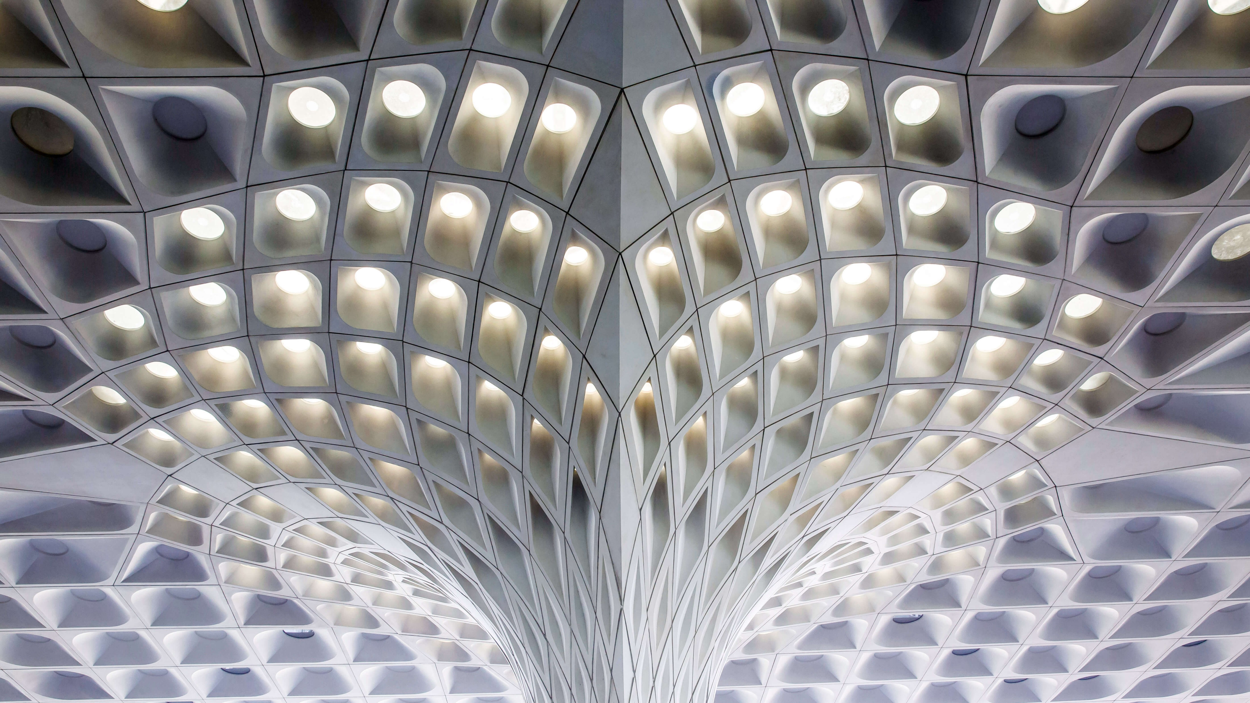Description: A large white structure with lights on it's sides and a ceiling with a pattern of squares and circles.