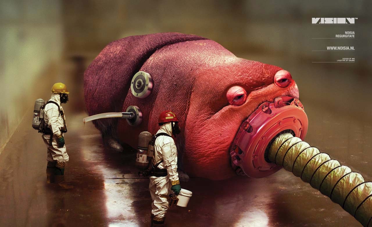 Description: A group of people in white suits and gas masks working on a giant red object with a hose attached to it.