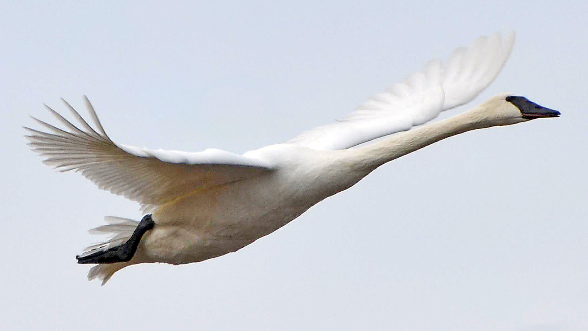 Description: A white swan flying through a blue sky with its wings spread out and it's head turned to the side.