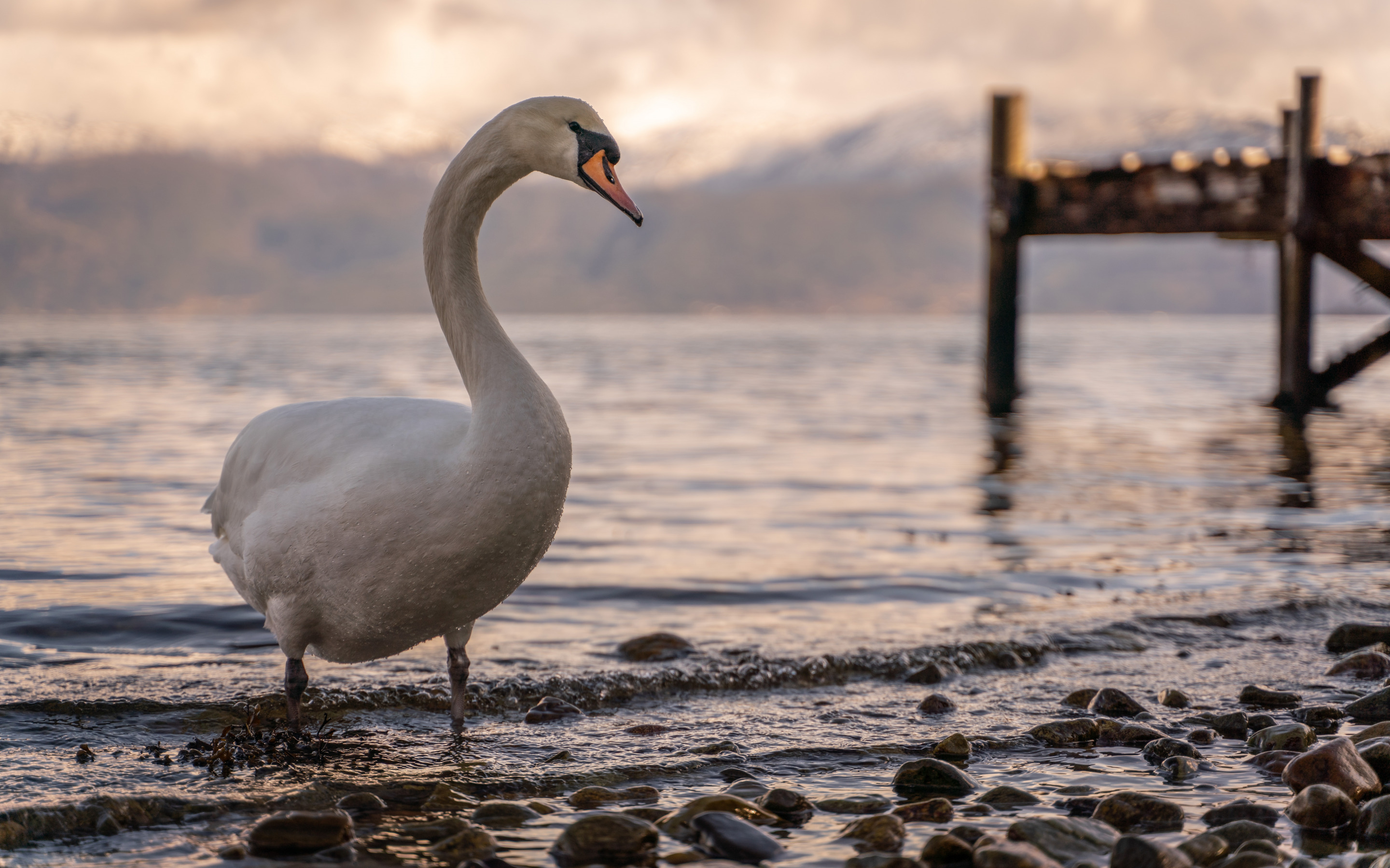 Description: A white swan standing on a rocky beach next to a pier and a body of water with a pier in the background.