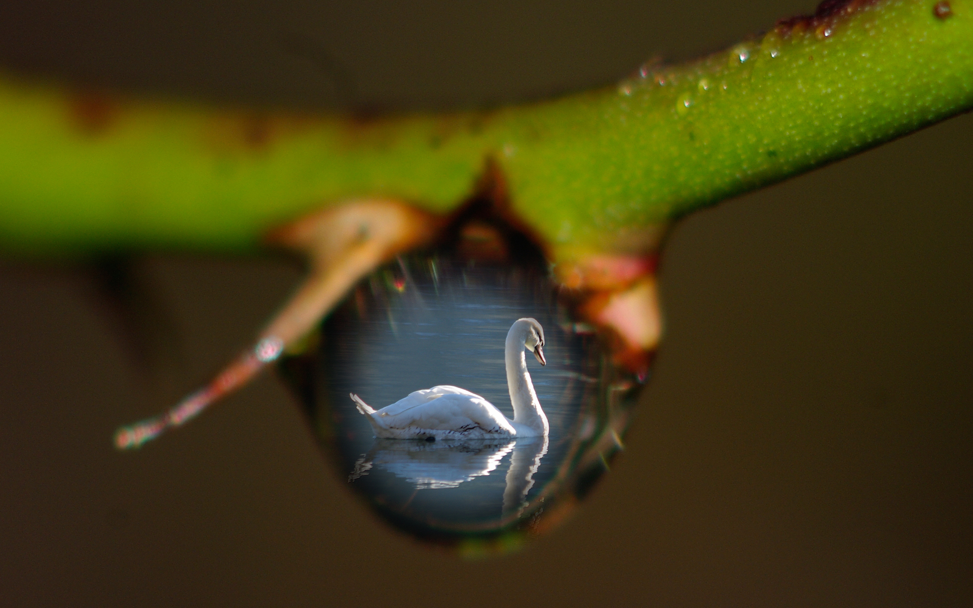 Description: A white swan is swimming in a pool of water on a green plant with a drop of water on it.