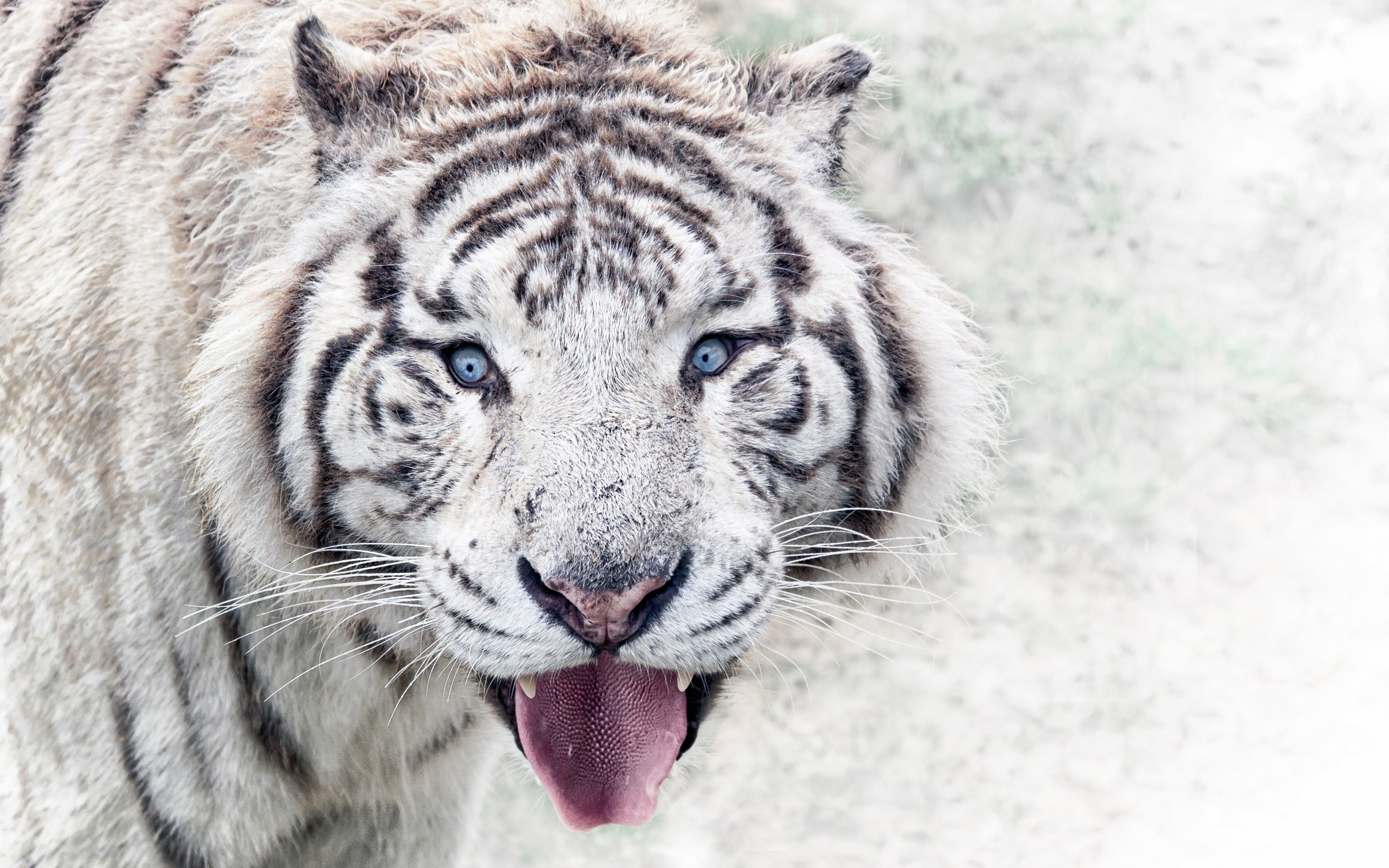 Description: A white tiger with its mouth open and tongue out with its tongue out and it's mouth wide open.