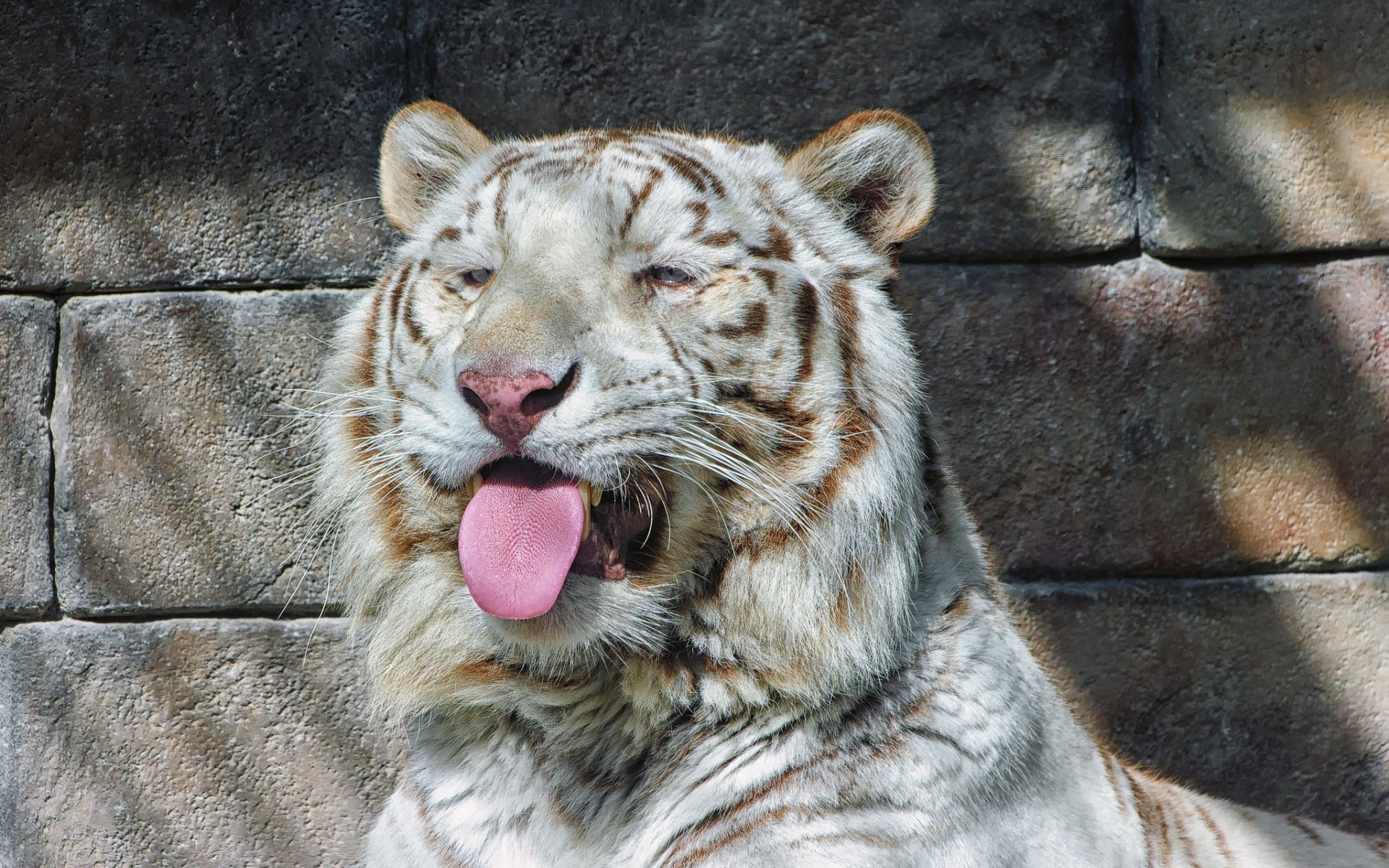 Description: A white tiger with its tongue out and its tongue out.