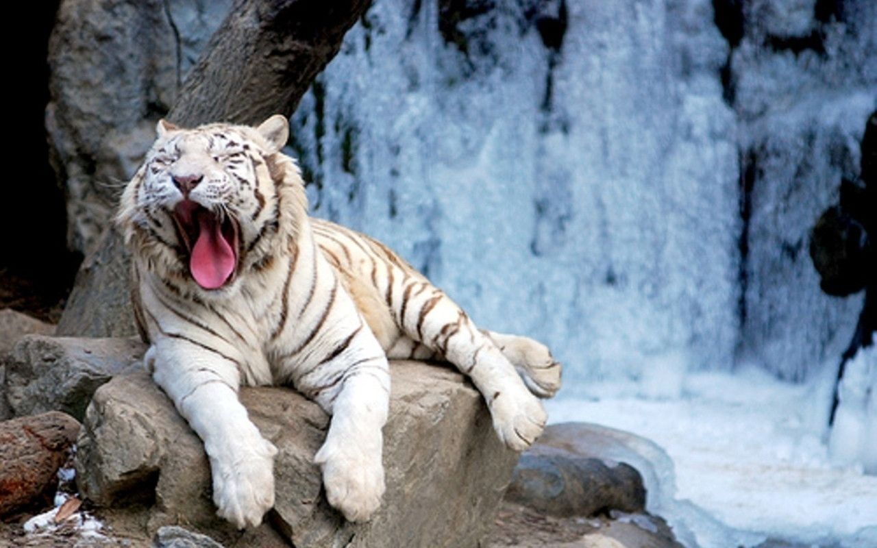 Description: A white tiger laying on a rock with a waterfall in the background and a tree in the foreground.