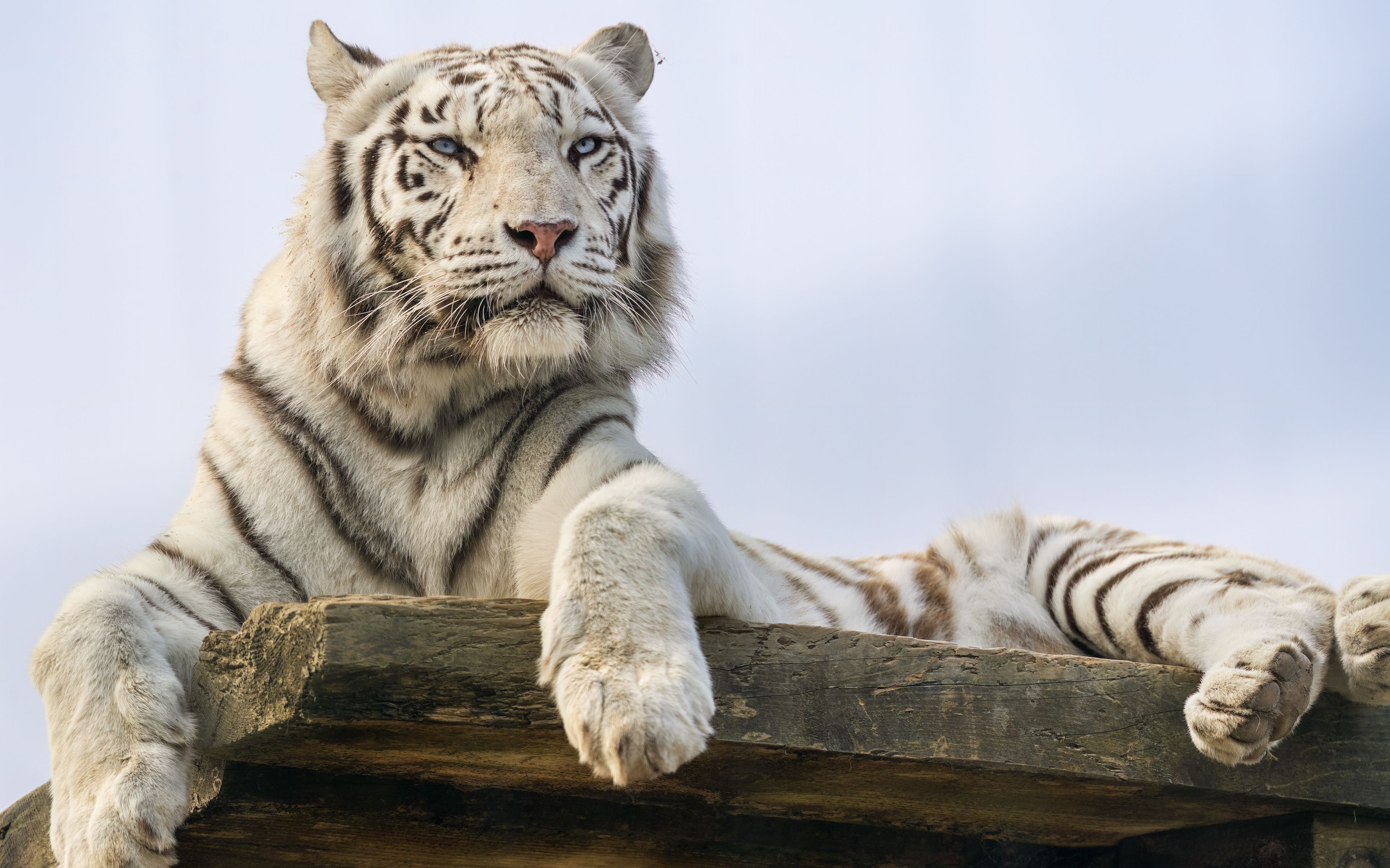Description: A white tiger sitting on top of a wooden structure with his paw on the top of a wooden structure.