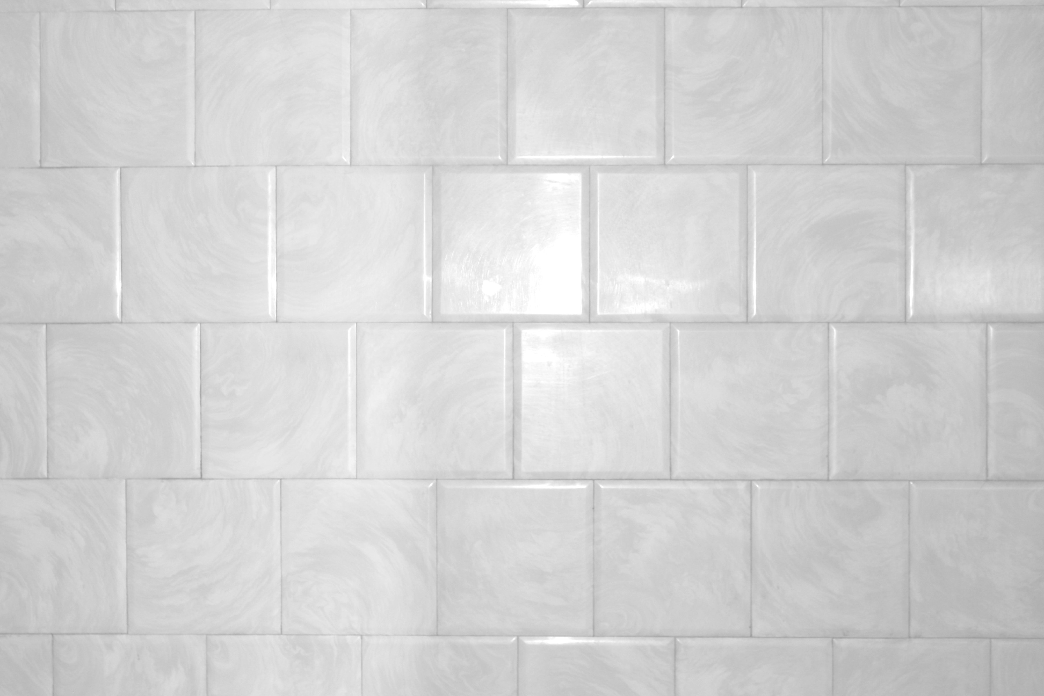 Description: A white tiled wall with a black and white cat sitting on it's side in front of it.