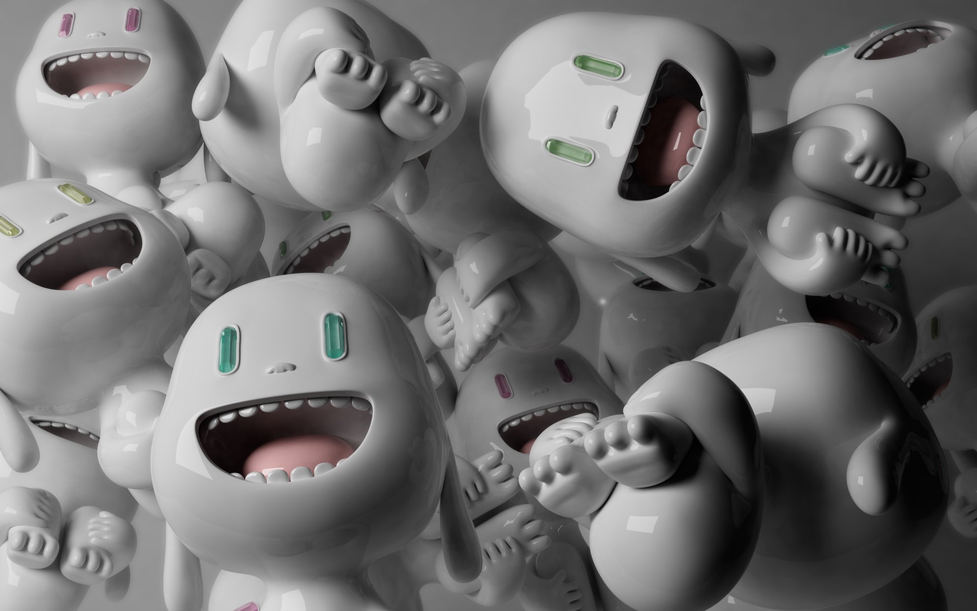 Description: A group of white toy figures with mouths open and eyes wide open.