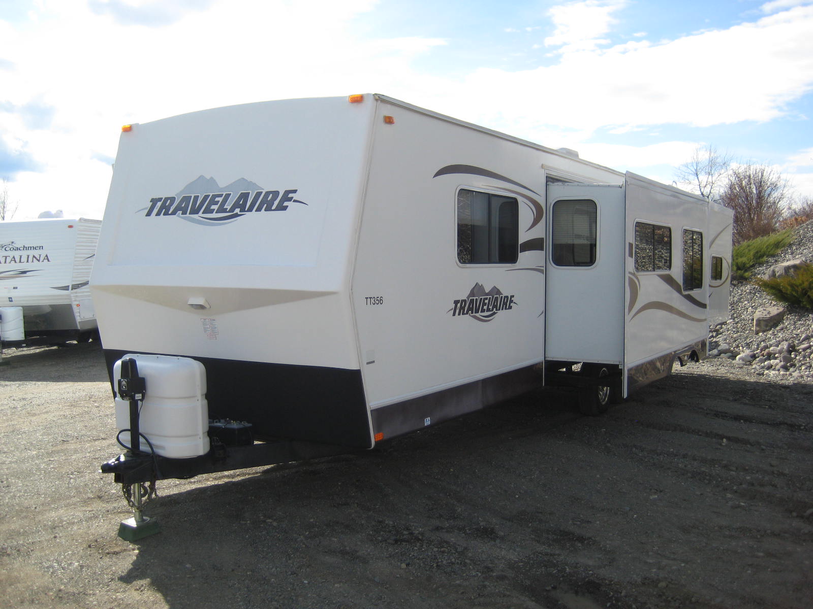 Description: A white trailer parked on a gravel road next to a forest and a sky background with clouds in the sky.