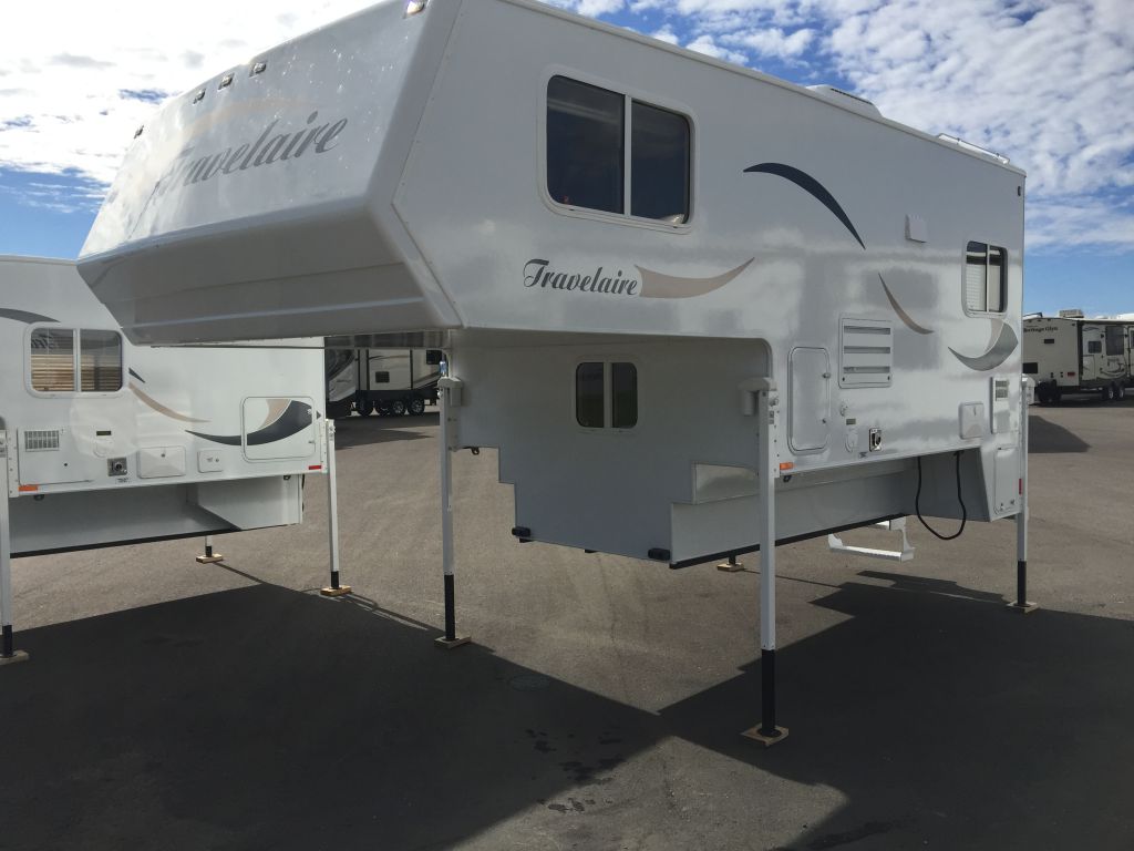 Description: A white trailer parked in a parking lot next to another trailer and trailer attached to it's sides.