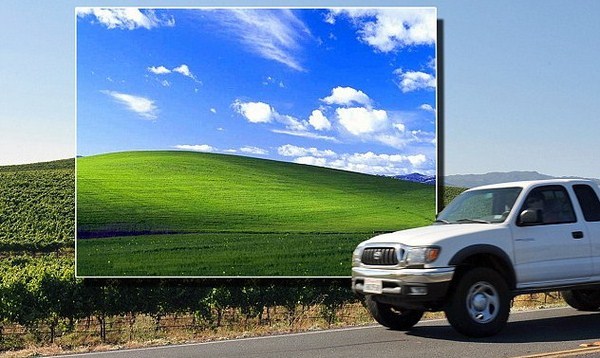 Description: A white truck driving down a road next to a green field of grass and a blue sky with clouds.