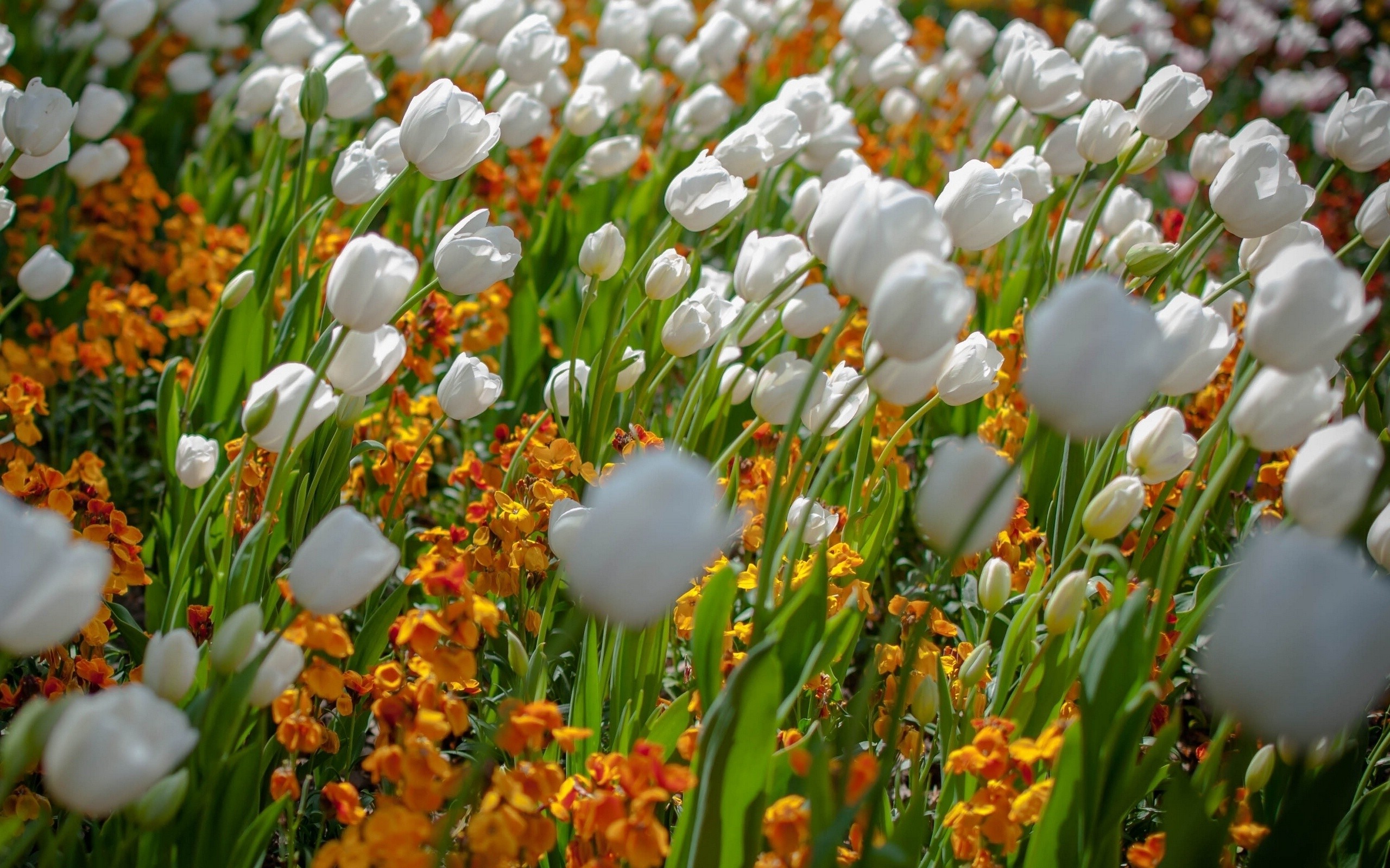 Description: A field of white tulips and yellow and orange flowers in the foreground with a green stem.