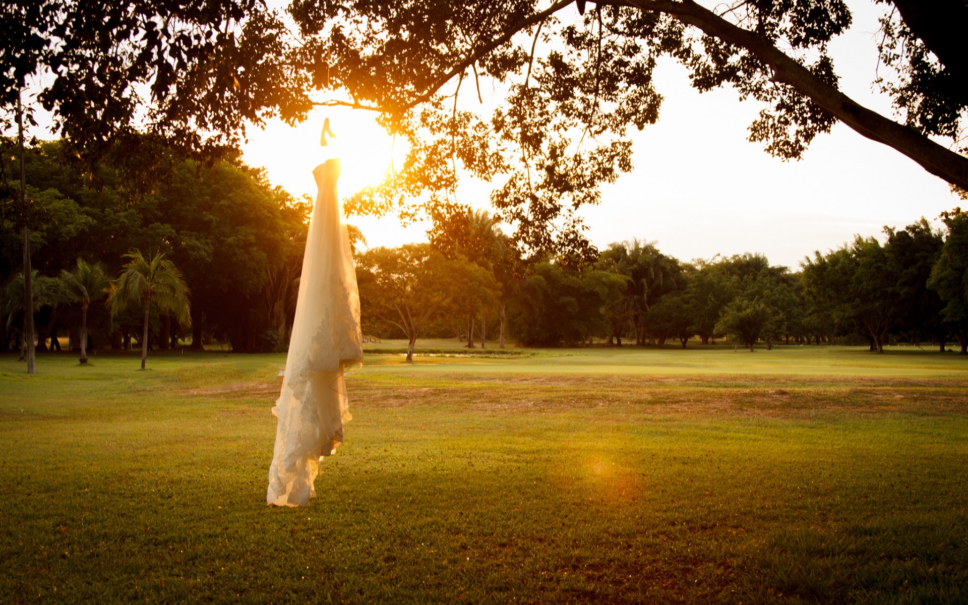 Description: A white umbrella is hanging in the grass near a tree and a field with trees in the background and the sun shining through the trees.