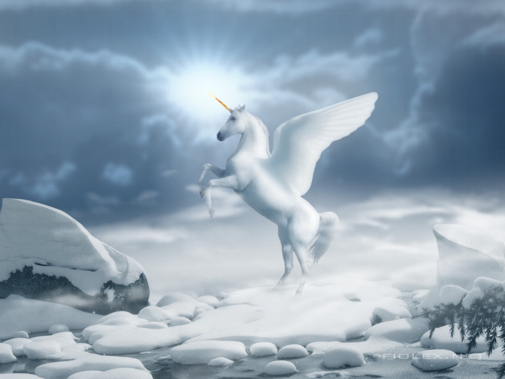 Description: A white unicorn flying over a river surrounded by ice and snow covered rocks and trees in the background with a sun shining through the clouds.