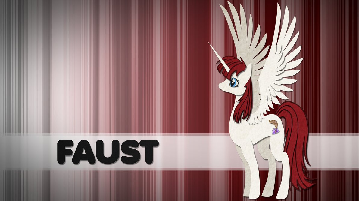 Description: A picture of a white unicorn with red manes and wings on it's back legs and the words faust on it.