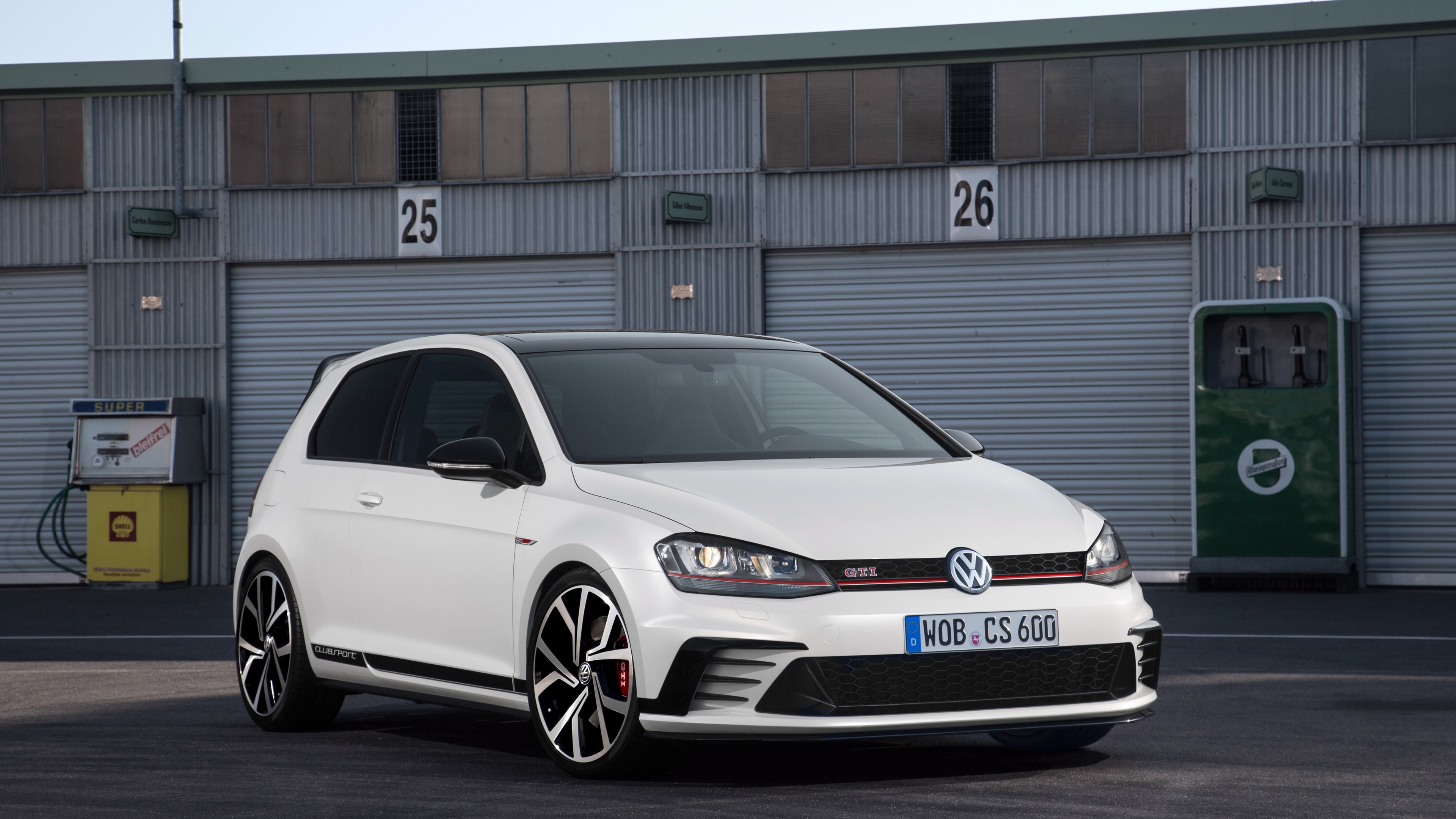 Description: A white volkswagen car parked in front of a garage door with a gas pump in the background and a gas pump in the foreground.
