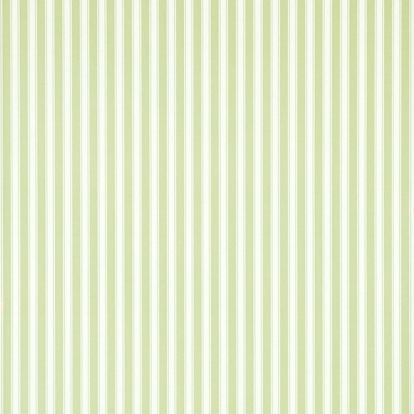 Description: A white wall with a green stripe pattern on it and a white vase with a flower in it on a table.
