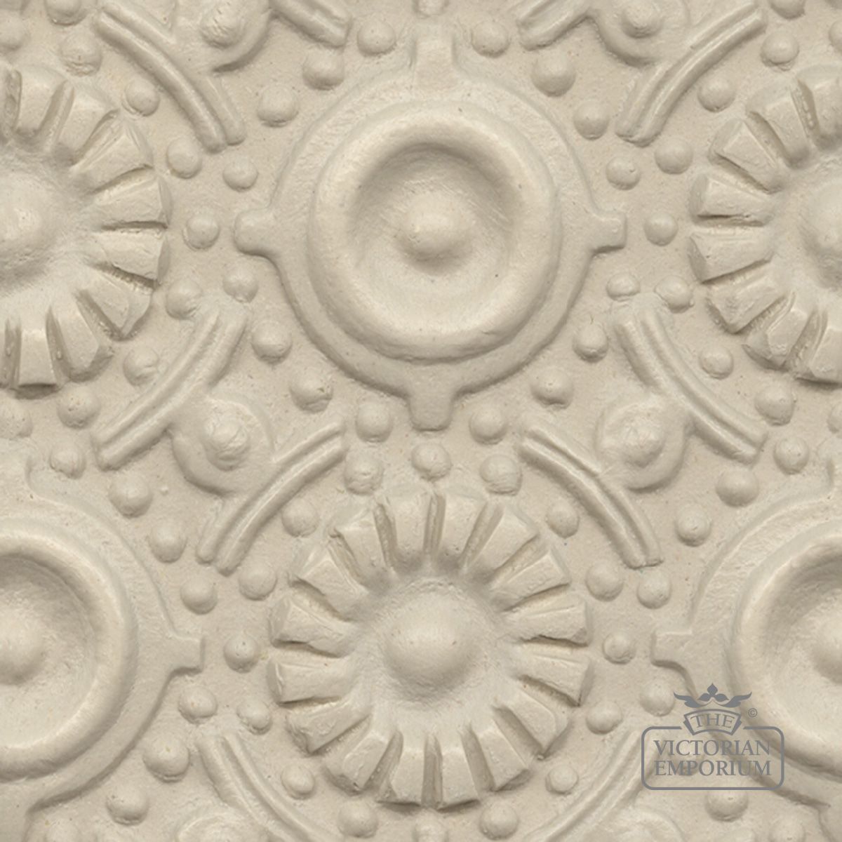 Description: A white wall with a pattern on it's surface and a circular design on the wall above it.