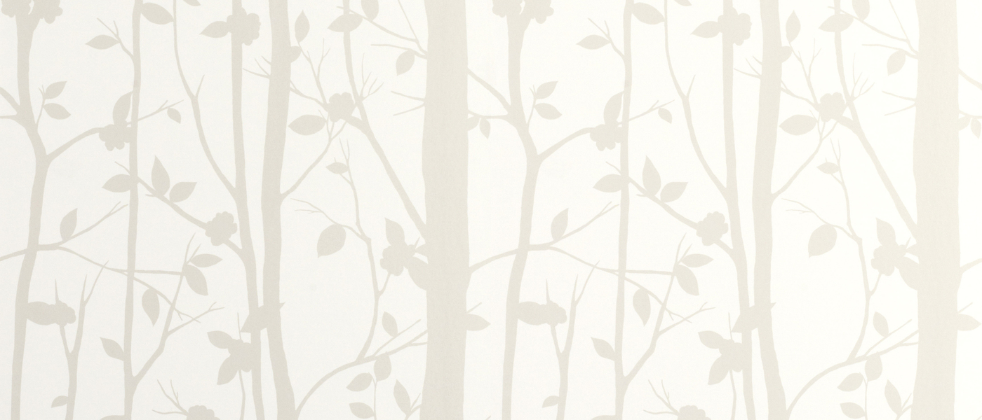 Description: A white wall with a tree pattern on it and a vase with flowers in it and a vase with a vase in front of it.