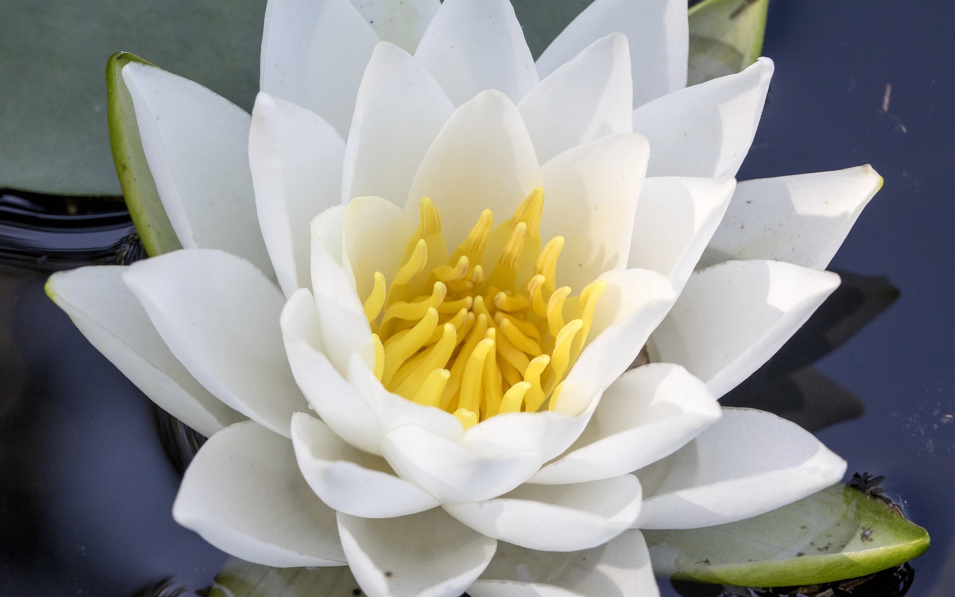 Description: A white water lily with yellow stamens floating in a pond of water with lily pads on the side.