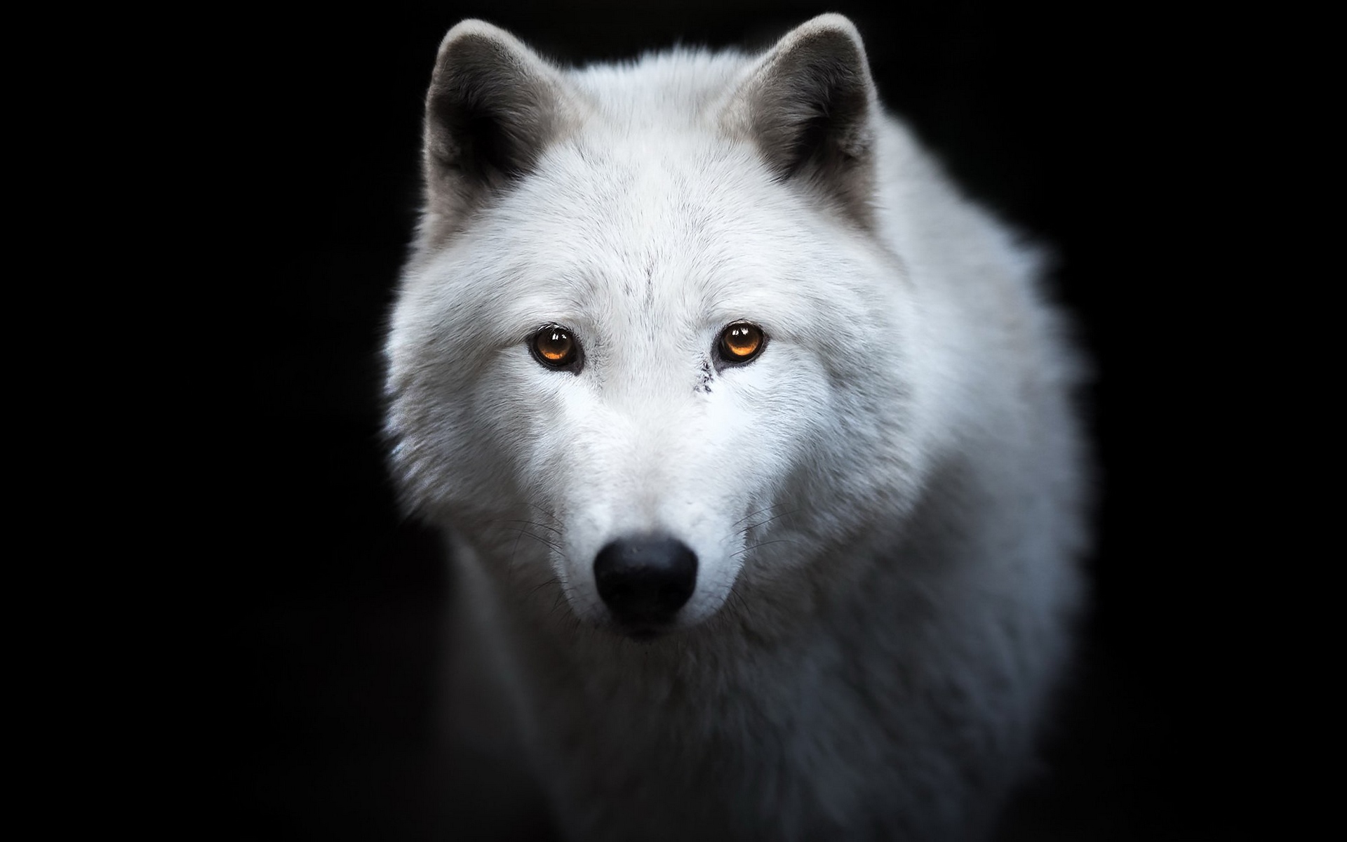 Description: A white wolf with yellow eyes looking at the camera with a black background and a black background with a white wolf.