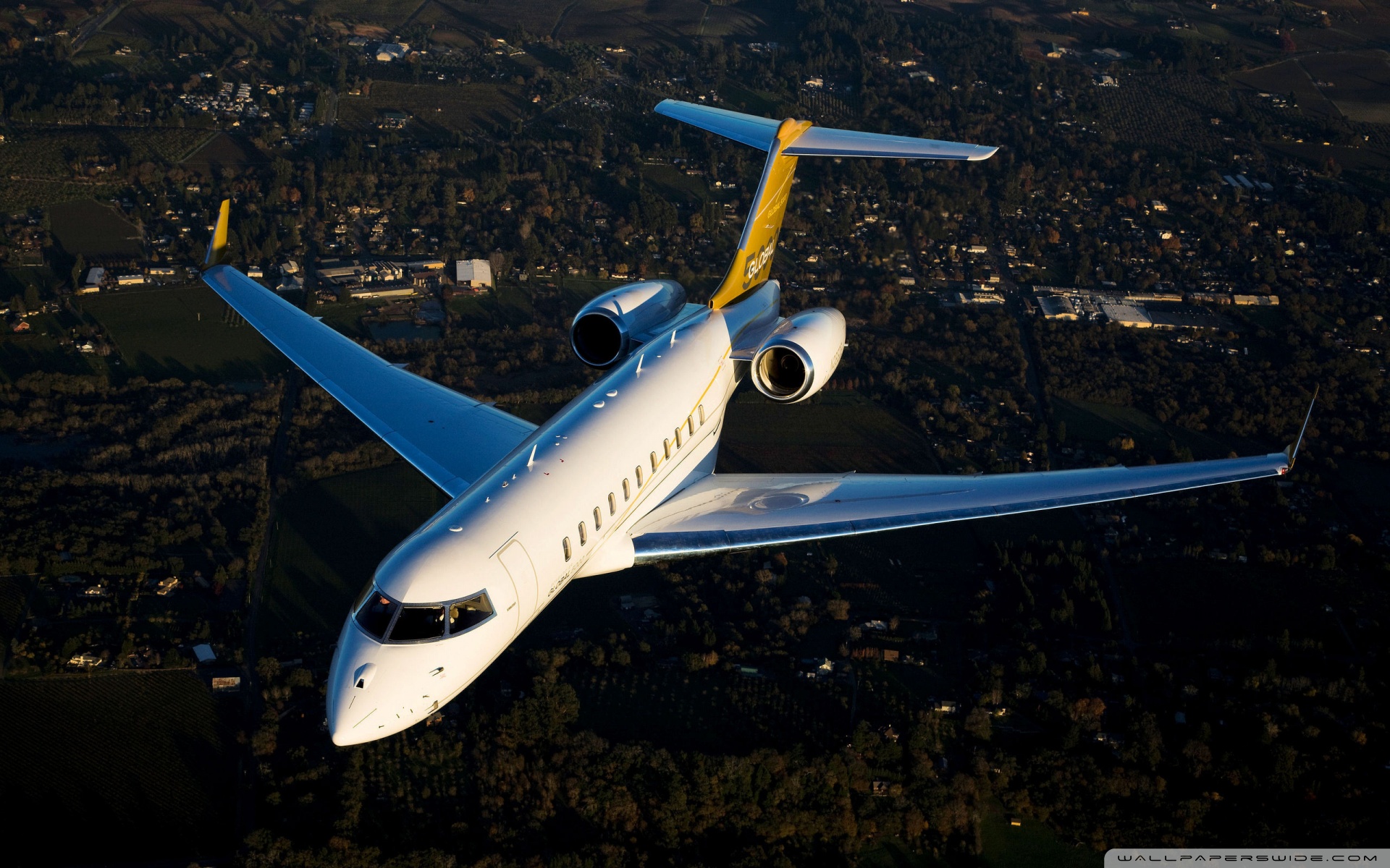 Description: A white and yellow airplane flying over a city area with trees and hills in the background and a sky line.