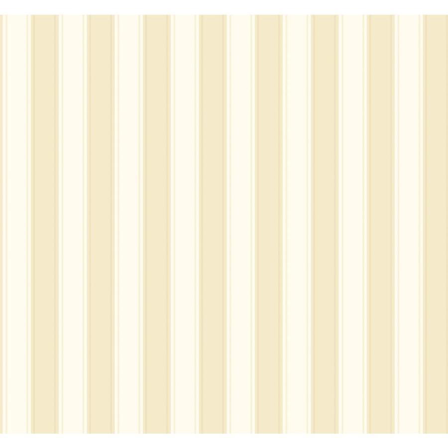 Description: A white and yellow striped wallpaper with a white border and a white vase with flowers on it.