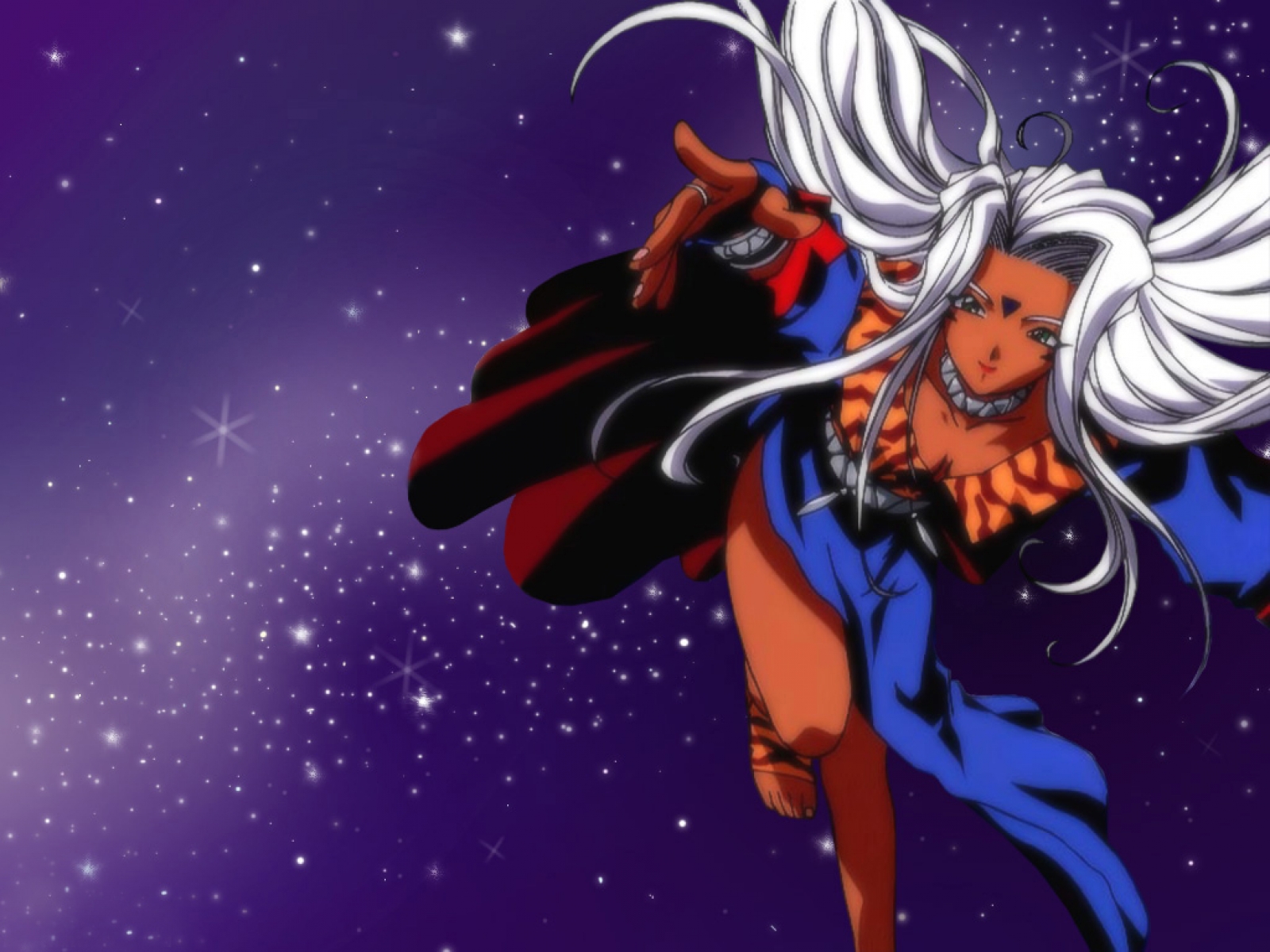 Description: A cartoon character with white hair and a blue dress holding a horse in the air with stars in the background.