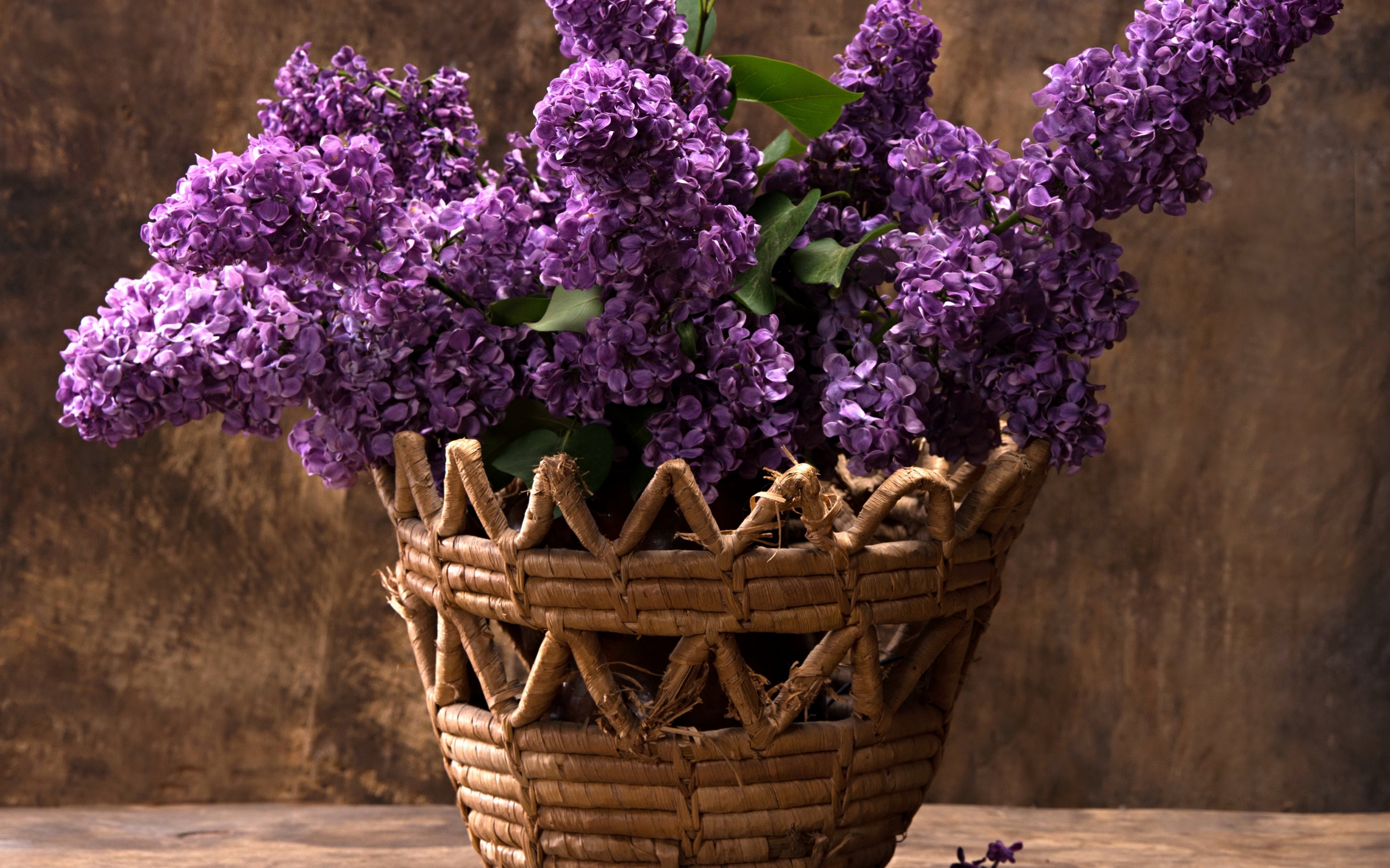 Description: A wicker basket with purple flowers in it on a table next to a wall and a wooden floor.