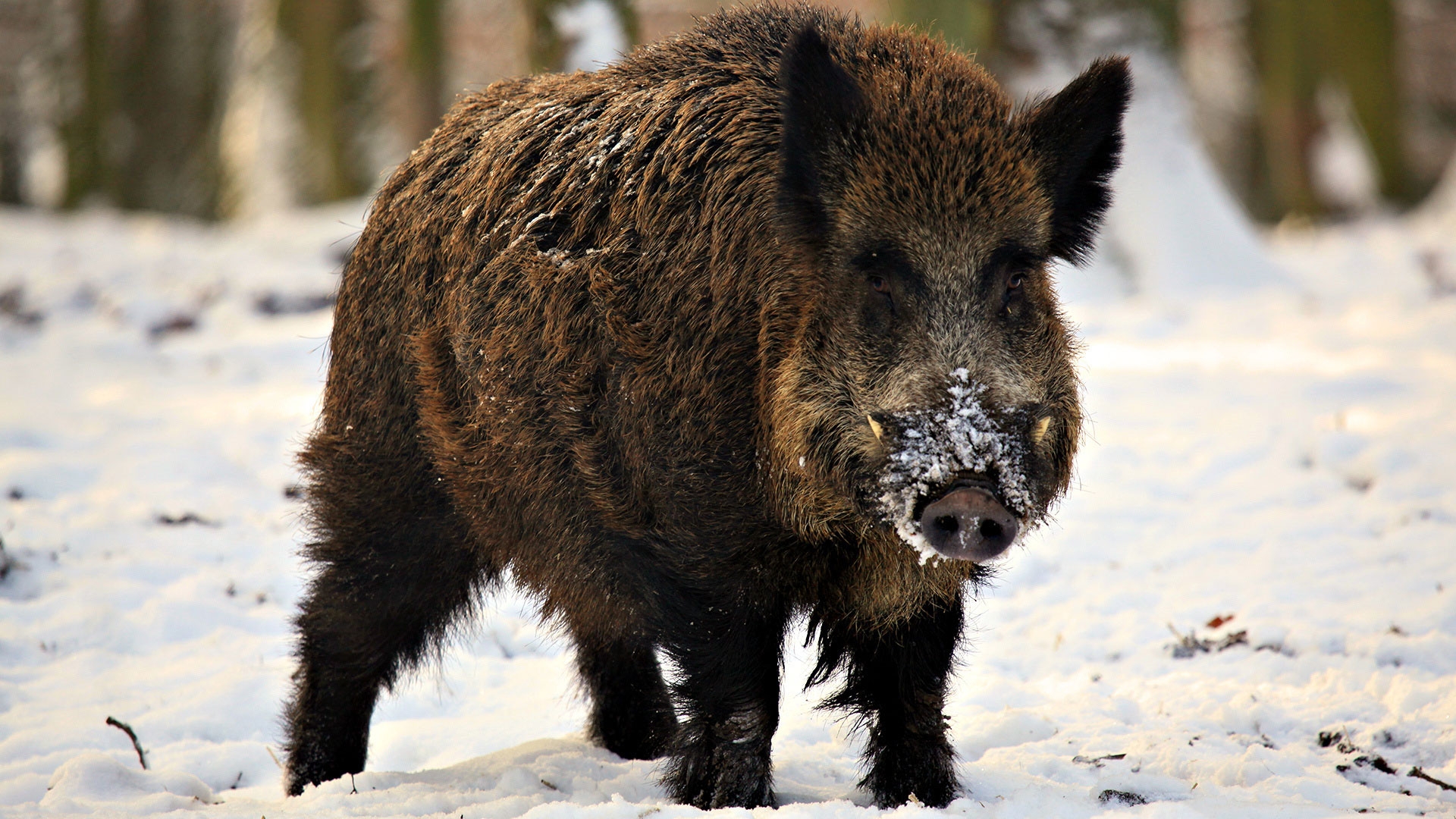 Description: A wild boar walking through the snow in a forest area with trees in the background and snow on its nose.