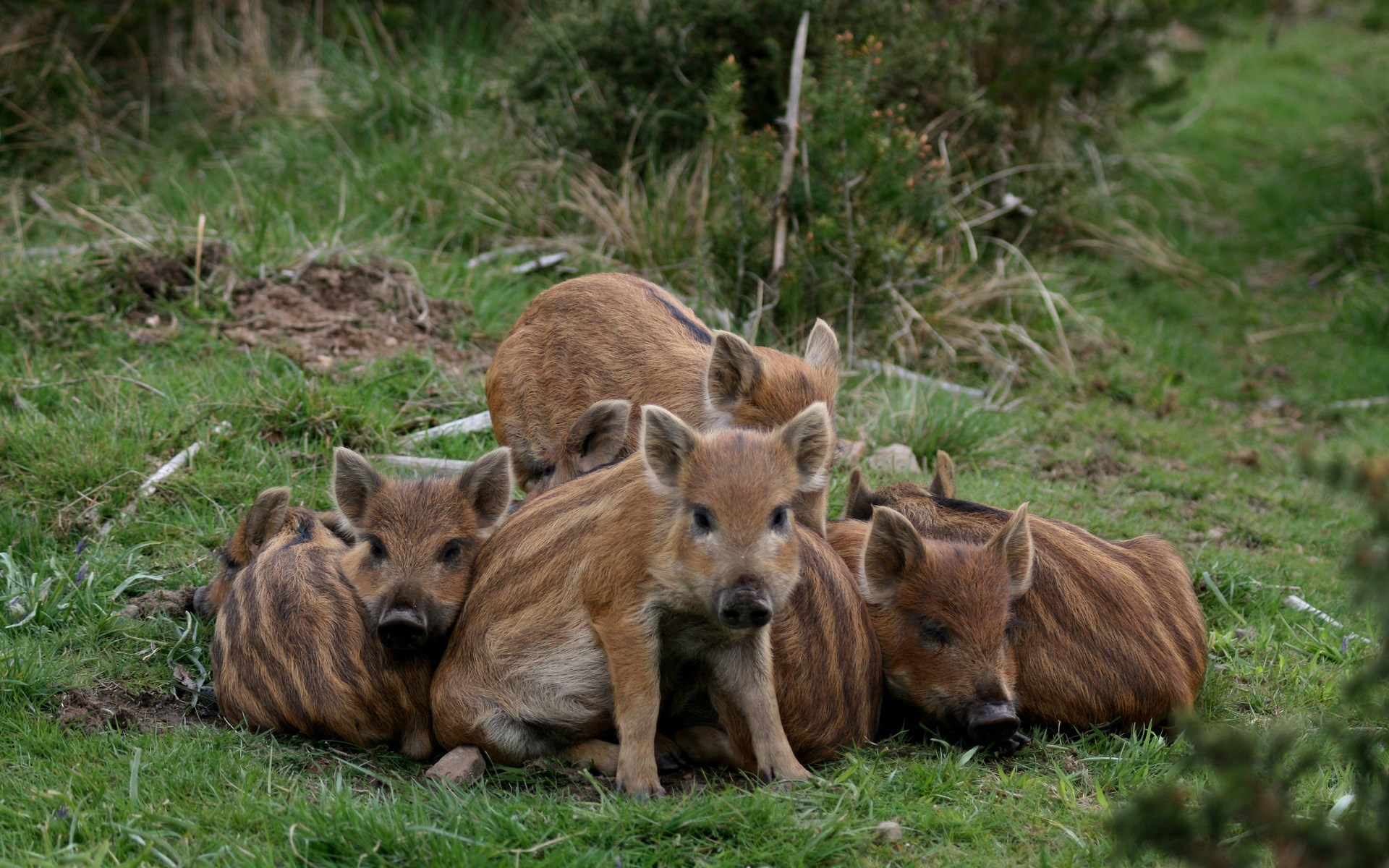 Description: A group of wild boars laying on the ground together in a field of grass and brush.