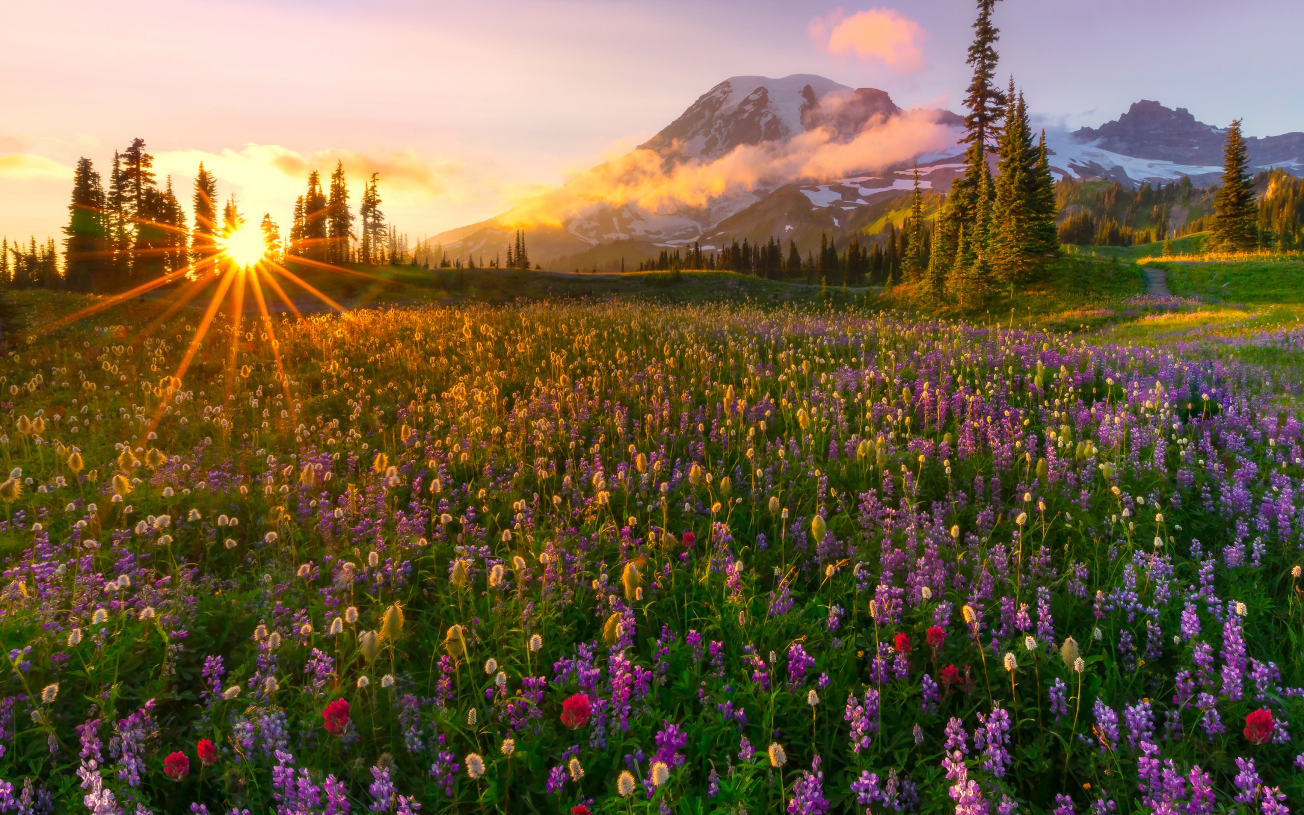 Description: A field of wildflowers with the sun setting in the background and a mountain in the distance with snow on the top.