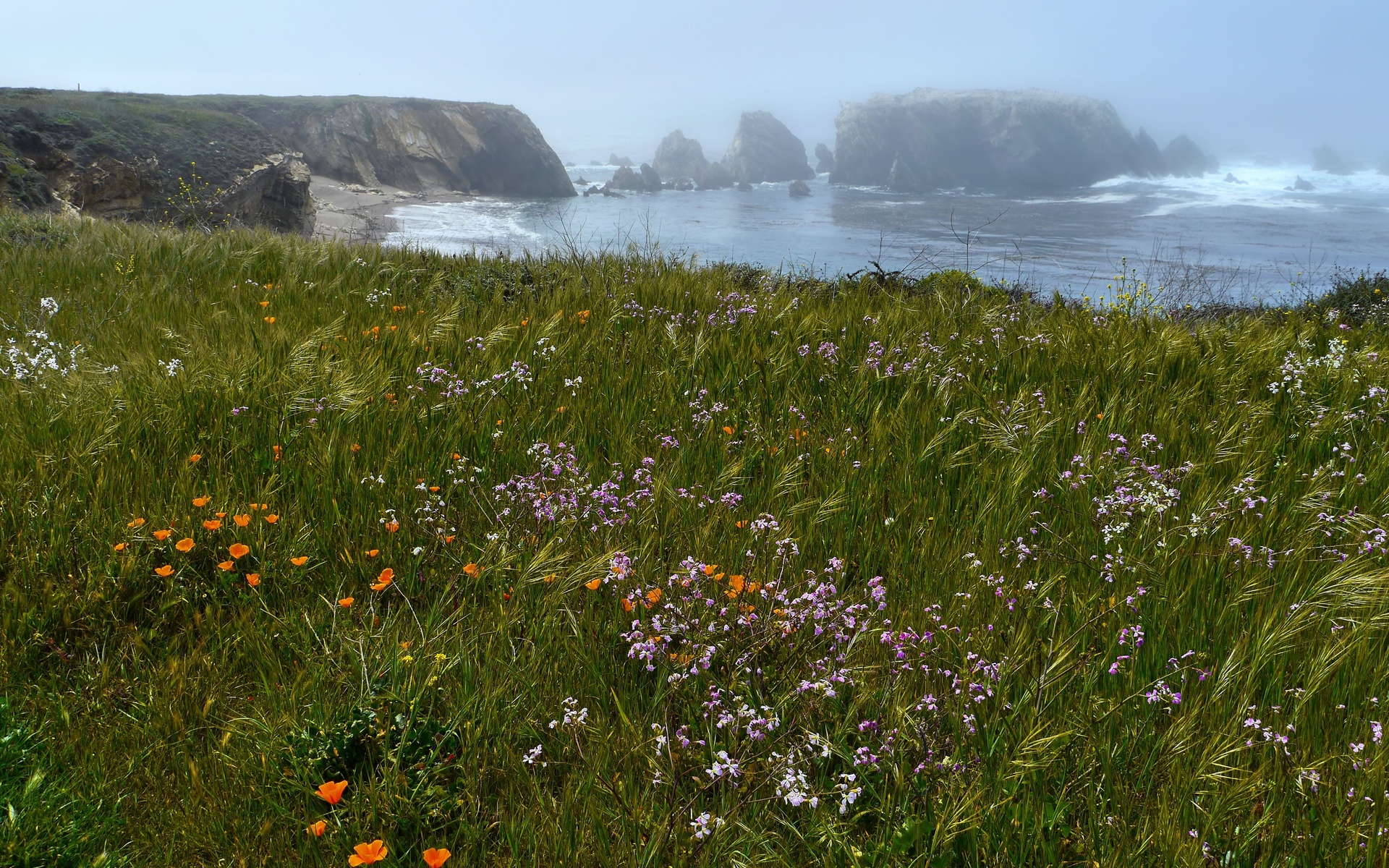 Description: A field of wildflowers and other flowers near the ocean with cliffs in the background in the fog.